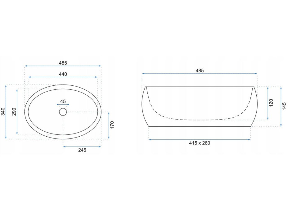 - Rozmer umývadla: 485 x 340 x 145 mm