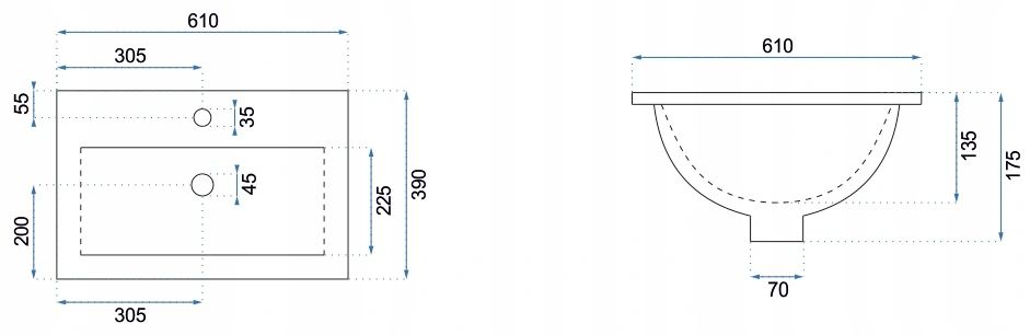 - Rozmer umývadla: 610 x 390 x 175 mm