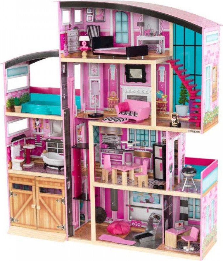 Domček pre bábiky Shimmer Mansion s vybavením od KidKraftu je vyrobený z kvalitného dreva. Vo štvorposchodovom domčeku je osem miestností a balkón. V domčeku je pohyblivý výťah, svietiace svetlá a toaleta so zvukom splachovania. Domček je cez 120 cm vysoký a je dostatočne veľký, aby sa s ním mohlo hrať viac detí naraz. Balenie obsahuje domček s viac ako 30 dielmi nábytku a príslušenstva. Hodí sa pre všetky bábiky do 30,5 cm (12") vrátane Barbie ®, LOL Surprise! ®, Disney Princess ®. Rozmery domčeka: 123,5 x 31,5 x 136,5 cm Vhodné pre deti od 3 rokov.Vlastnosti