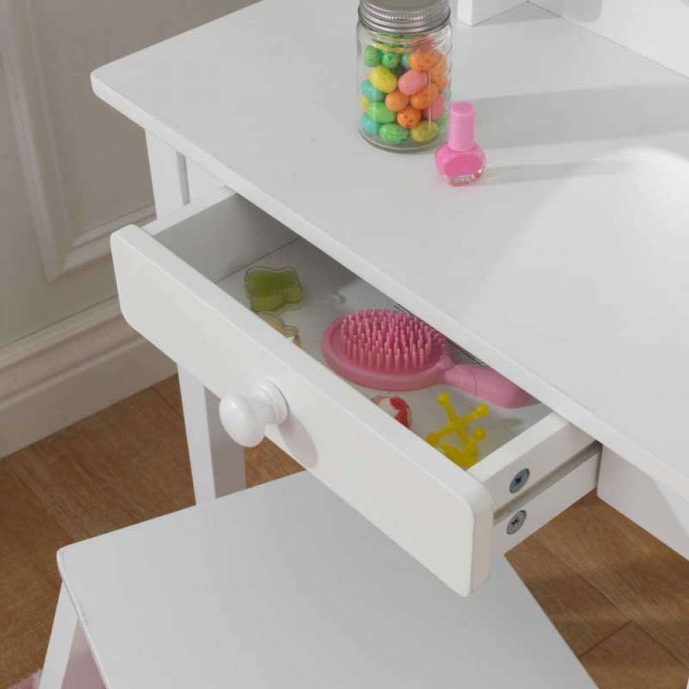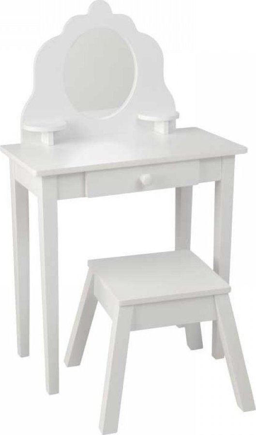 Každá malá parádnica potrebuje svoj vlastný kozmetický kútik! Elegantný kozmetický stolček so stoličkou KidKraft sa bude páčiť aj Vašemu dievčatku. Sada je vyrobená z kvalitného dreva a zrkadlo je odolné voči rozbitiu. Súčasťou stolčeka je malá zásuvka, kam si dievčatká môžu schovať svoj prvý make-up. Stolička sa vďaka svojej veľkosti dá prisunúť až tesne k zrkadlu a nanášanie šminiek tak bude ešte pohodlnejšie. Stolček môže slúžiť aj ako priestor na maľovanie alebo kreatívne tvorenie. Rozmery stolčeka: 100 x 66 x 31 cm Rozmery stoličky: 45 x 37 x 34 cm Súčasťou balenia je aj prehľadný návod na zostavenie nábytku. Vhodné pre deti od 3 rokov. Ilustratívne video, dodávaný nábytok má tvar ako na produktových fotografiách.Vlastnosti