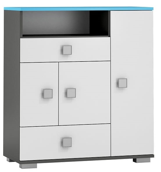 Komoda kolekcia Blue v lesklom prevedení sa vyznačuje vysokou kvalitou remeselného spracovania, ktoré spolu s použitím kvalitných lamino dosiek a MDF dosiek o sile 18 mm s ABS ochranou okrajov zaručuje bezproblémové užívanie a dlhú životnosť. Korpus komody je vyrobený z lamino dosiek v grafitovom a modrom polomatnom prevedení. Čelá sú vyrobené z MDF dosiek, ktoré boli pokryté bielou živicou. Tá dodáva čelom hladký a lesklý vzhľad imitujúce sklo.