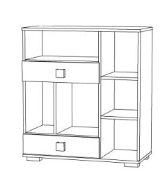 Komoda je rozdelená na jednu vysokú skrinku v pravej časti, ktorá je dvoma policami rozdelená na 3 komory a na ľavú časti s 1 otvorenou policou, 2 zásuvkami a 2 krídlovými skrinkami.