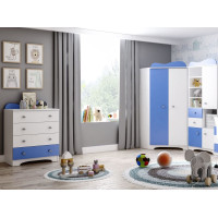 Moderná komoda CLOUDS vyrobená z kvalitných lamino dosiek o sile 18 mm kombinuje bielu farbu s farebným odtieňom na šuplíku a ozdobnom čele. Hrany nábytku sú zakončené ABS/PVC, ktoré ho chránia pred mechanickým poškodením a vlhkosťou. Komoda obsahuje štyri priestranné šuplíky osadené plastovými úchytmi v tvare mráčikov, charakteristickými pre celú kolekciu. Úchyty dodávajú nábytku jedinečný charakter a štýl.