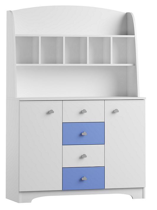 Praktická komoda CLOUDS je vyrobená z kvalitných lamino dosiek o hrúbke 18 mm. Hrany nábytku sú zakončené ABS/PVC materiálom, ktorý ho chráni pred mechanickým poškodením a vlhkosťou. Biely korpus komody je doplnený o farebné čelá šuplíkov, ktorých odtieň si môžete vybrať z našej bohatej ponuky. Komoda obsahuje štyri šuplíky a dve skrinky s policou po stranách. Dvierka aj čelá šuplíkov sú osadené plastovými úchytmi v tvare mráčika, charakteristickými pre celú kolekciu. Úchyty dodávajú nábytku jedinečný charakter a štýl. Vďaka nástavcu získate mnoho úložného priestoru navyše a všetko potrebné bude mať hneď po ruke.