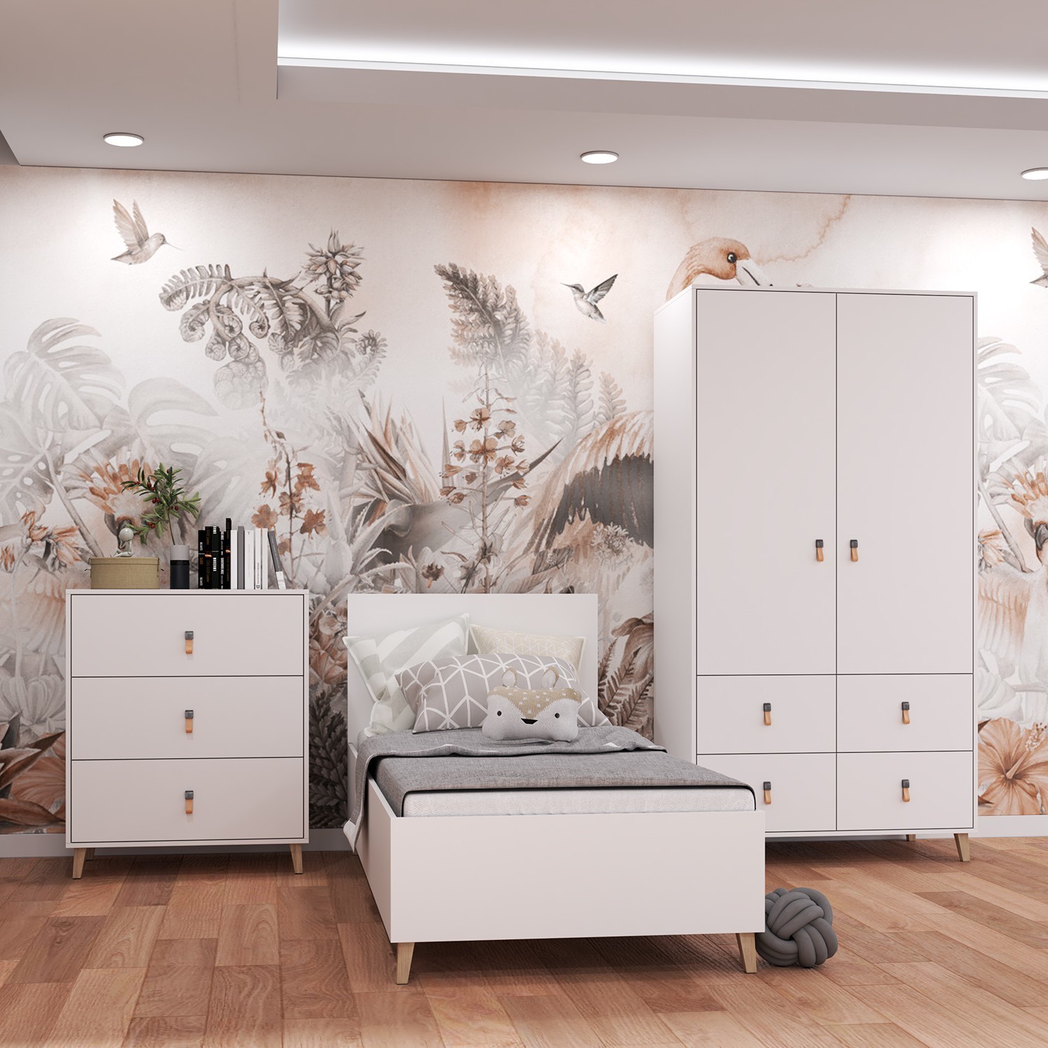 Komoda FALCO s tromi priestrannými zásuvkami je ideálna na ukladanie oblečenia, hračiek a ďalších drobností. Jej moderný škandinávsky štýl sa ľahko hodí do rôznych interiérov a kožené úchytky dodávajú nábytku príjemný tón. Komoda je vybavená drevenými nohami, ktoré jej dodávajú na elegancii a je možné ju ľahšie presúvať a upratovať okolo nej. Guľôčkové výsuvy zaručujú plynulé otváranie a zatváranie zásuviek. Komoda FALCO je funkčný a esteticky pôsobivý kus nábytku, ktorý skvele doplní akýkoľvek interiér.