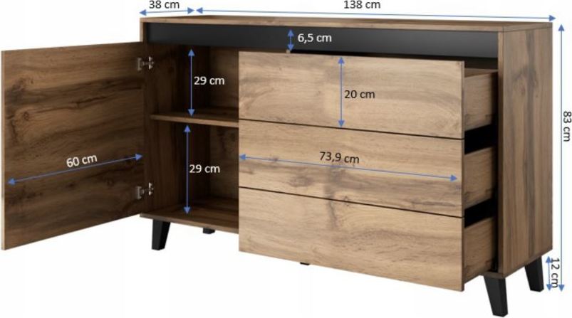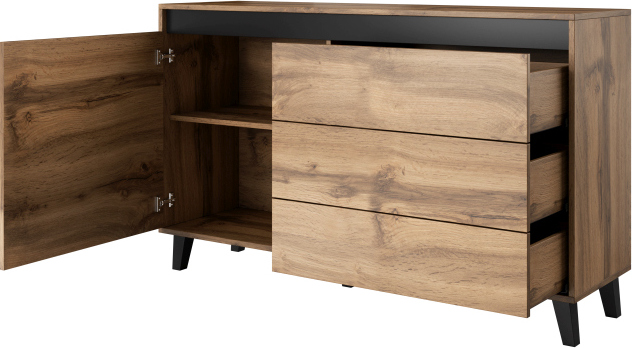 Stalová komoda NORD v škandinávskom štýle sa hodí do každého interiéru. Skladá sa ľavej časti s policou uzavretou dvierkami a z troch šuplíkov na pravej strane. Komoda nemá úchytky, šuplíky sa otvárajú systémom push-to-open a dvierka push-click. To komode dodáva minimalistický, elegantný vzhľad. Lamino dosky, z ktorých je komoda vyrobená, sú kvalitné, stabilné a dlho vydržia. Čierne plastové nožičky dodávajú komode moderný vzhľad. Komoda je vyrábaná v dekore dub wotan v kombinácii s antracitovou farbou.