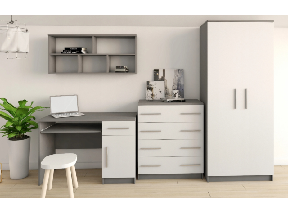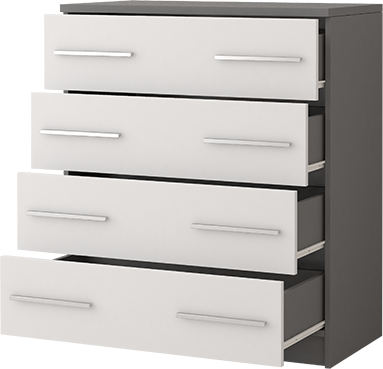 Komoda ORVILLE je praktický kus nábytku s moderným dizajnom, ktorý sa ľahko začlení do akéhokoľvek interiéru. Štyri priestranné zásuvky s čelami bielej farby a striebornými PVC úchytkami poskytujú dostatok úložného priestoru. Korpus komody v odtieni šedej je vyrobený z kvalitnej laminovanej dosky s hrúbkou 16 mm, ktorá je odolná proti poškriabaniu, poškodeniu, vlhkosti a vysokým teplotám. Hrany sú zakončené ABS lištou, čo zaisťuje ich odolnosť a pevnosť.