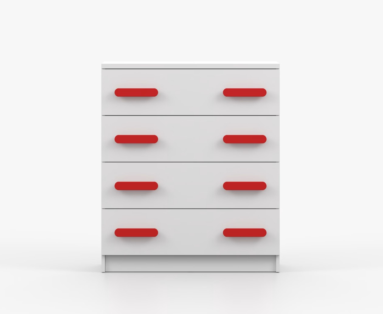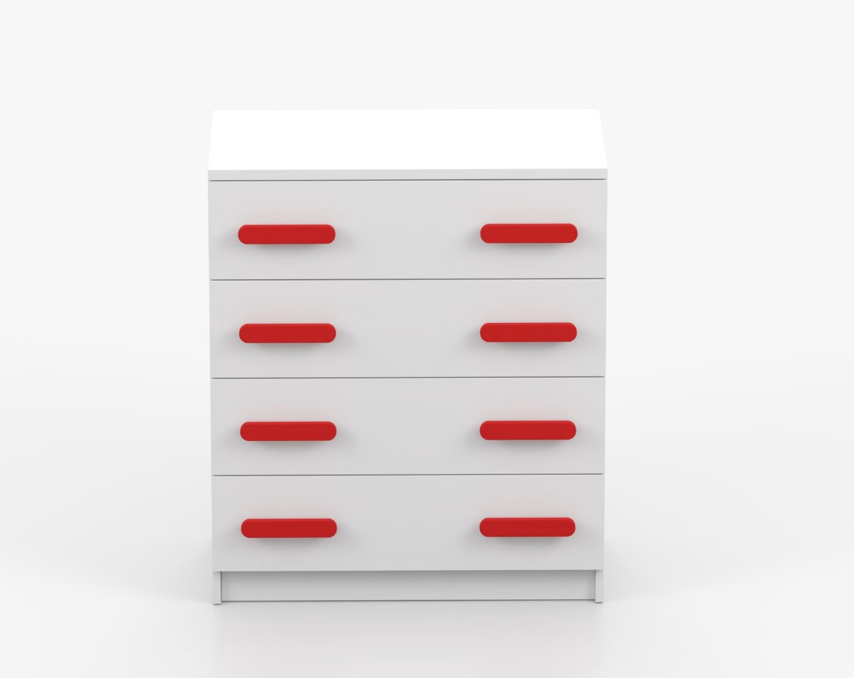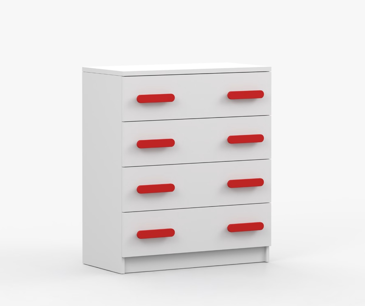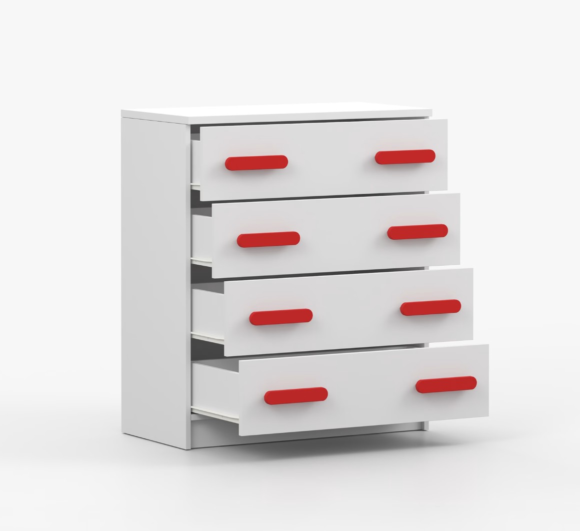 Komoda SCOUT je praktický kus nábytku s moderným dizajnom, ktorý sa ľahko začlení do akéhokoľvek interiéru. Štyri priestranné zásuvky s farebnými úchytkami poskytujú dostatok úložného priestoru. Komoda je vyrobená z kvalitnej laminovanej dosky s hrúbkou 16 mm, ktorá je odolná proti poškriabaniu, poškodeniu, vlhkosti a vysokým teplotám. Hrany sú zakončené ABS lištou, čo zaisťuje ich odolnosť a pevnosť.
