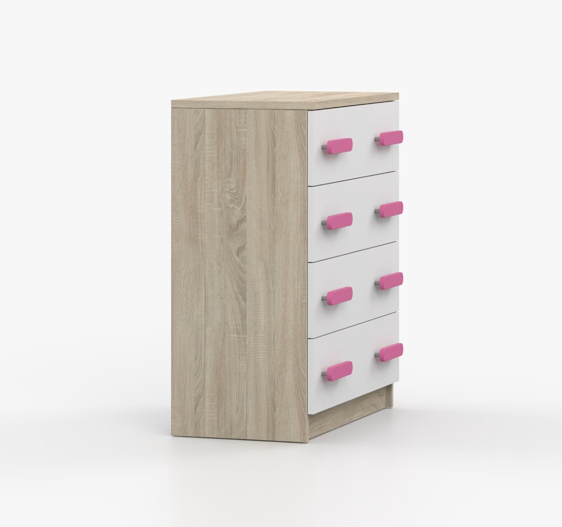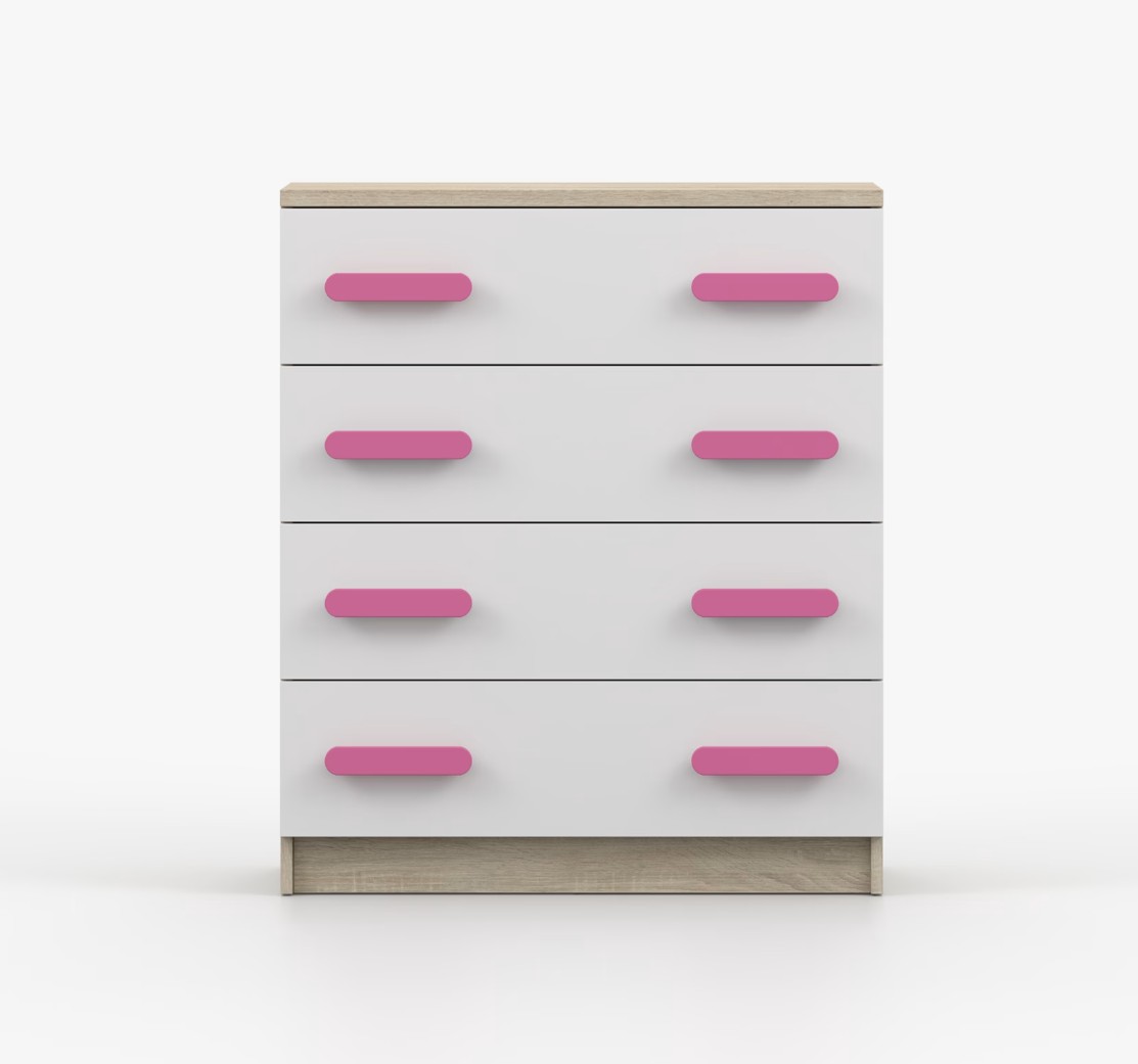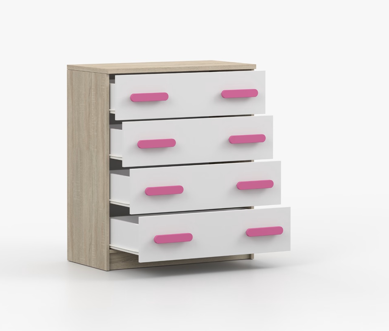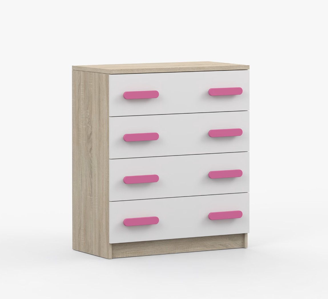 Komoda SCOUT je praktický kus nábytku s moderným dizajnom, ktorý sa ľahko začlení do akéhokoľvek interiéru. Štyri priestranné zásuvky s farebnými úchytkami poskytujú dostatok úložného priestoru. Komoda je vyrobená z kvalitnej laminovanej dosky s hrúbkou 16 mm, ktorá je odolná proti poškriabaniu, poškodeniu, vlhkosti a vysokým teplotám. Hrany sú zakončené ABS lištou, čo zaisťuje ich odolnosť a pevnosť.