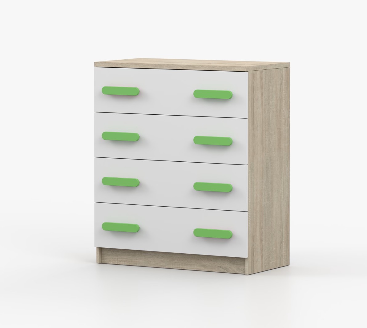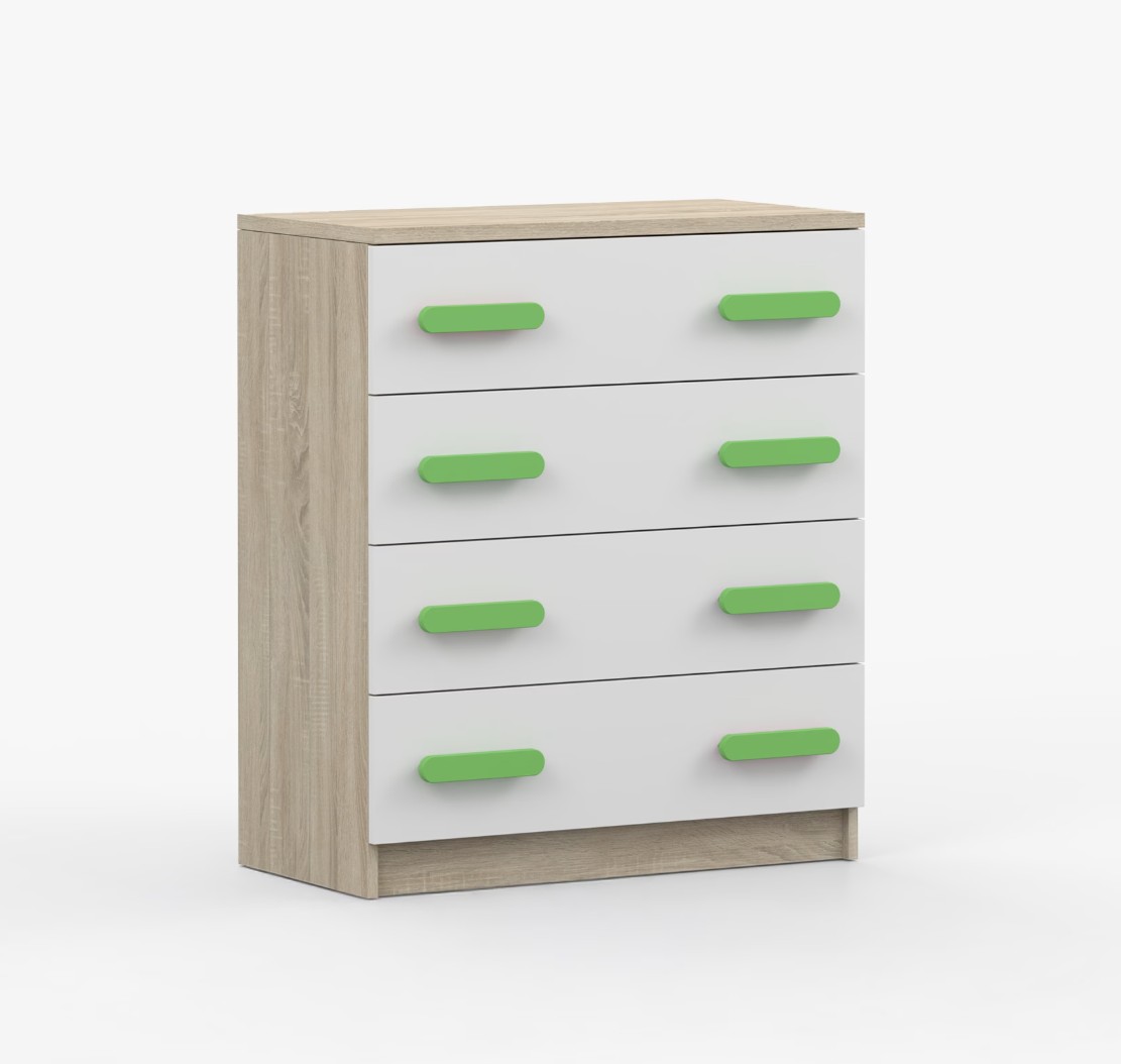 Komoda SCOUT je praktický kus nábytku s moderným dizajnom, ktorý sa ľahko začlení do akéhokoľvek interiéru. Štyri priestranné zásuvky s farebnými úchytkami poskytujú dostatok úložného priestoru. Komoda je vyrobená z kvalitnej laminovanej dosky s hrúbkou 16 mm, ktorá je odolná proti poškriabaniu, poškodeniu, vlhkosti a vysokým teplotám. Hrany sú zakončené ABS lištou, čo zaisťuje ich odolnosť a pevnosť.