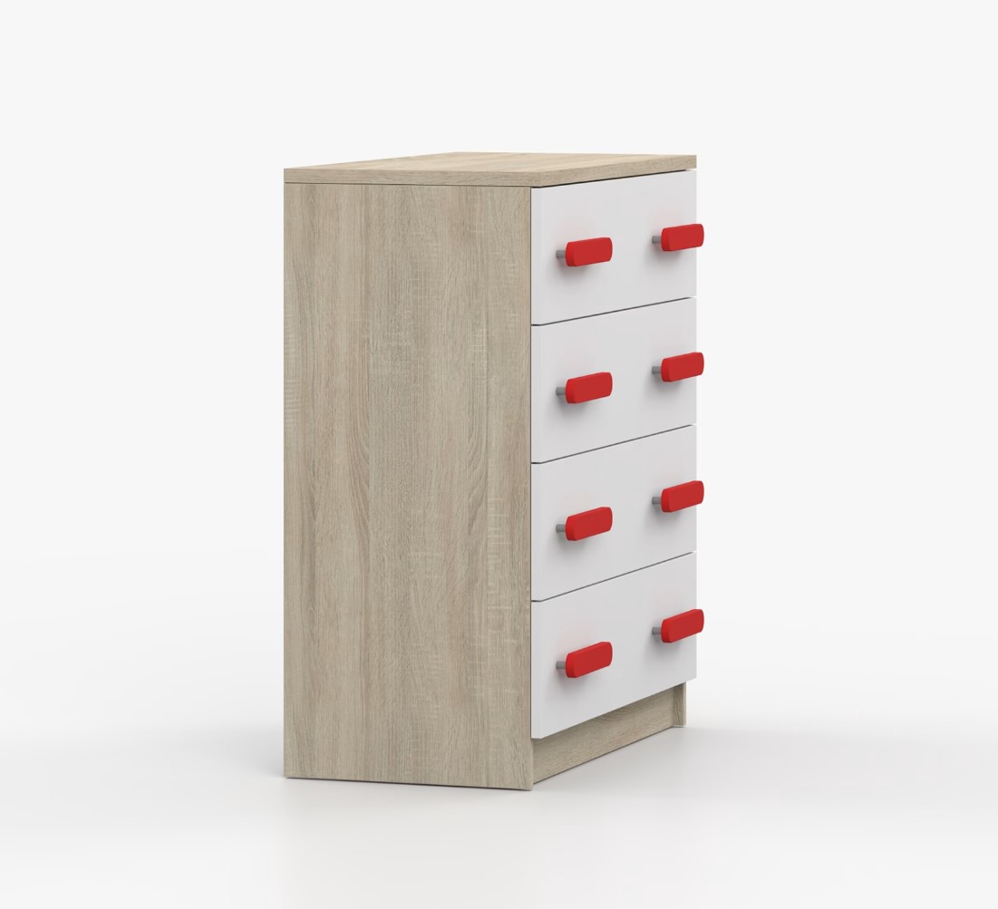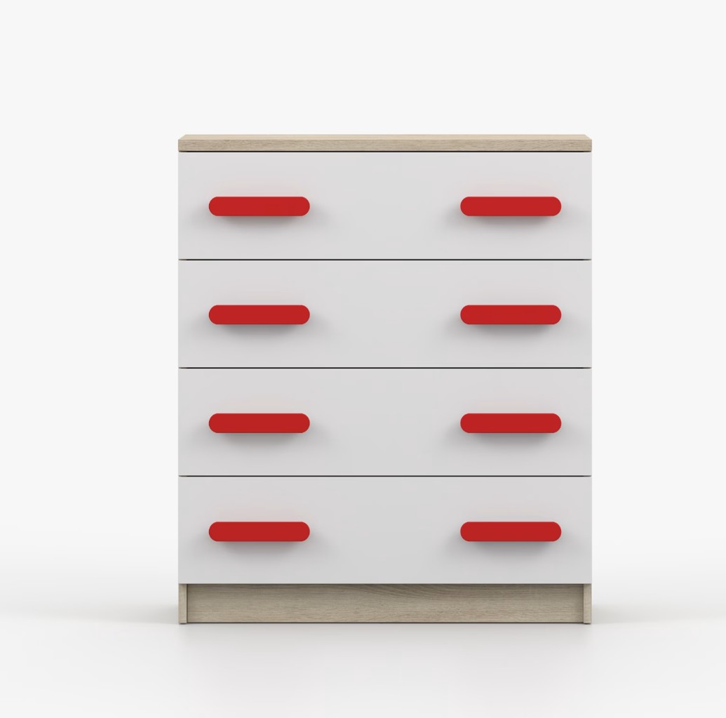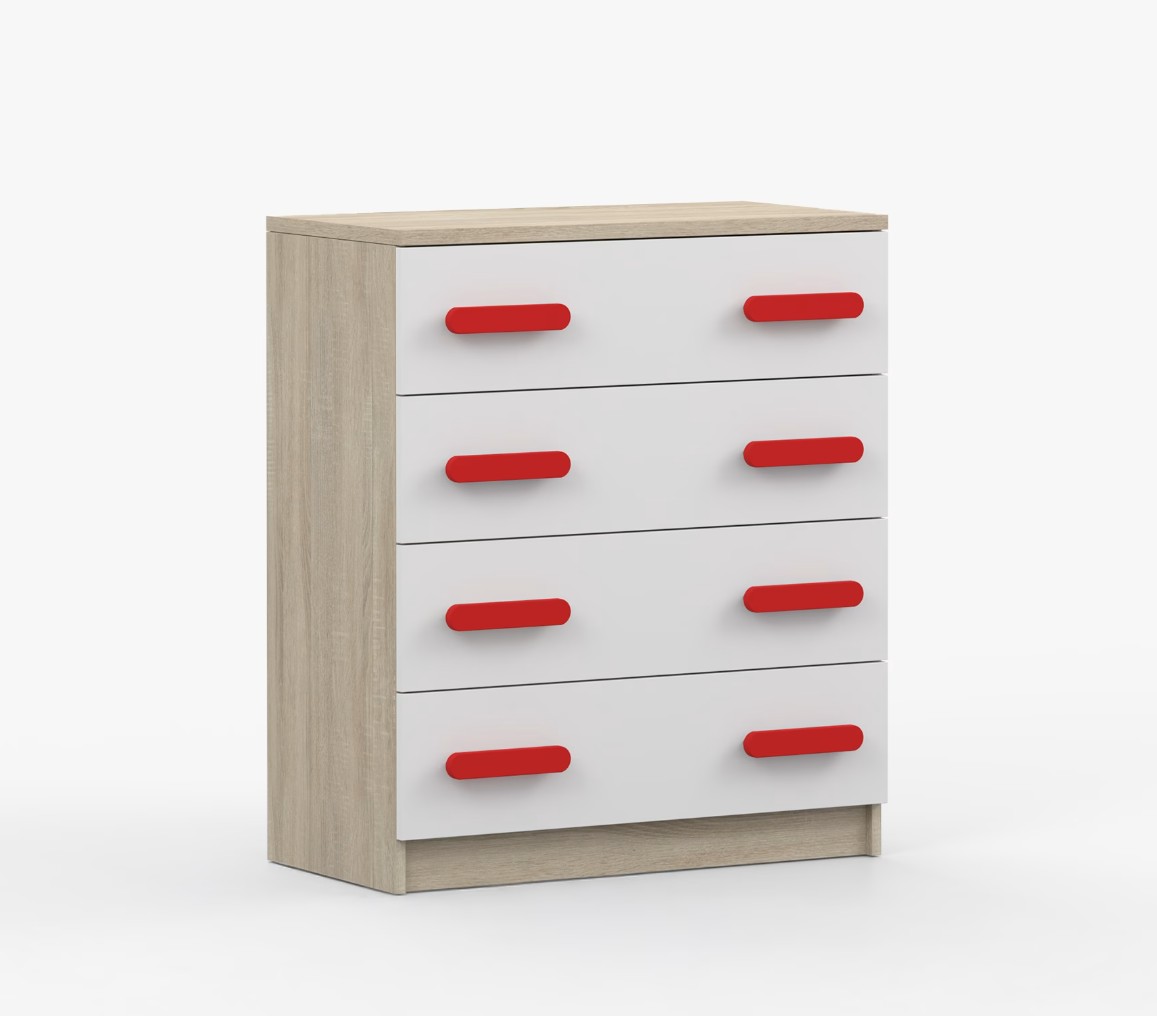 Komoda SCOUT je praktický kus nábytku s moderným dizajnom, ktorý sa ľahko začlení do akéhokoľvek interiéru. Štyri priestranné zásuvky s farebnými úchytkami poskytujú dostatok úložného priestoru. Komoda je vyrobená z kvalitnej laminovanej dosky s hrúbkou 16 mm, ktorá je odolná proti poškriabaniu, poškodeniu, vlhkosti a vysokým teplotám. Hrany sú zakončené ABS lištou, čo zaisťuje ich odolnosť a pevnosť.