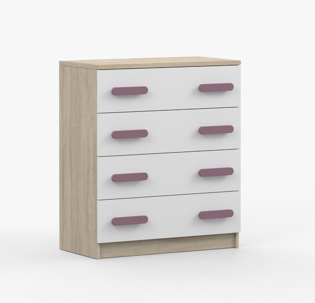 Komoda SCOUT je praktický kus nábytku s moderným dizajnom, ktorý sa ľahko začlení do akéhokoľvek interiéru. Štyri priestranné zásuvky s farebnými úchytkami poskytujú dostatok úložného priestoru. Komoda je vyrobená z kvalitnej laminovanej dosky s hrúbkou 16 mm, ktorá je odolná proti poškriabaniu, poškodeniu, vlhkosti a vysokým teplotám. Hrany sú zakončené ABS lištou, čo zaisťuje ich odolnosť a pevnosť.