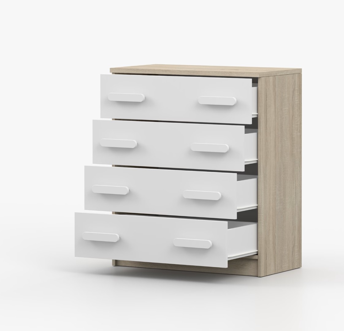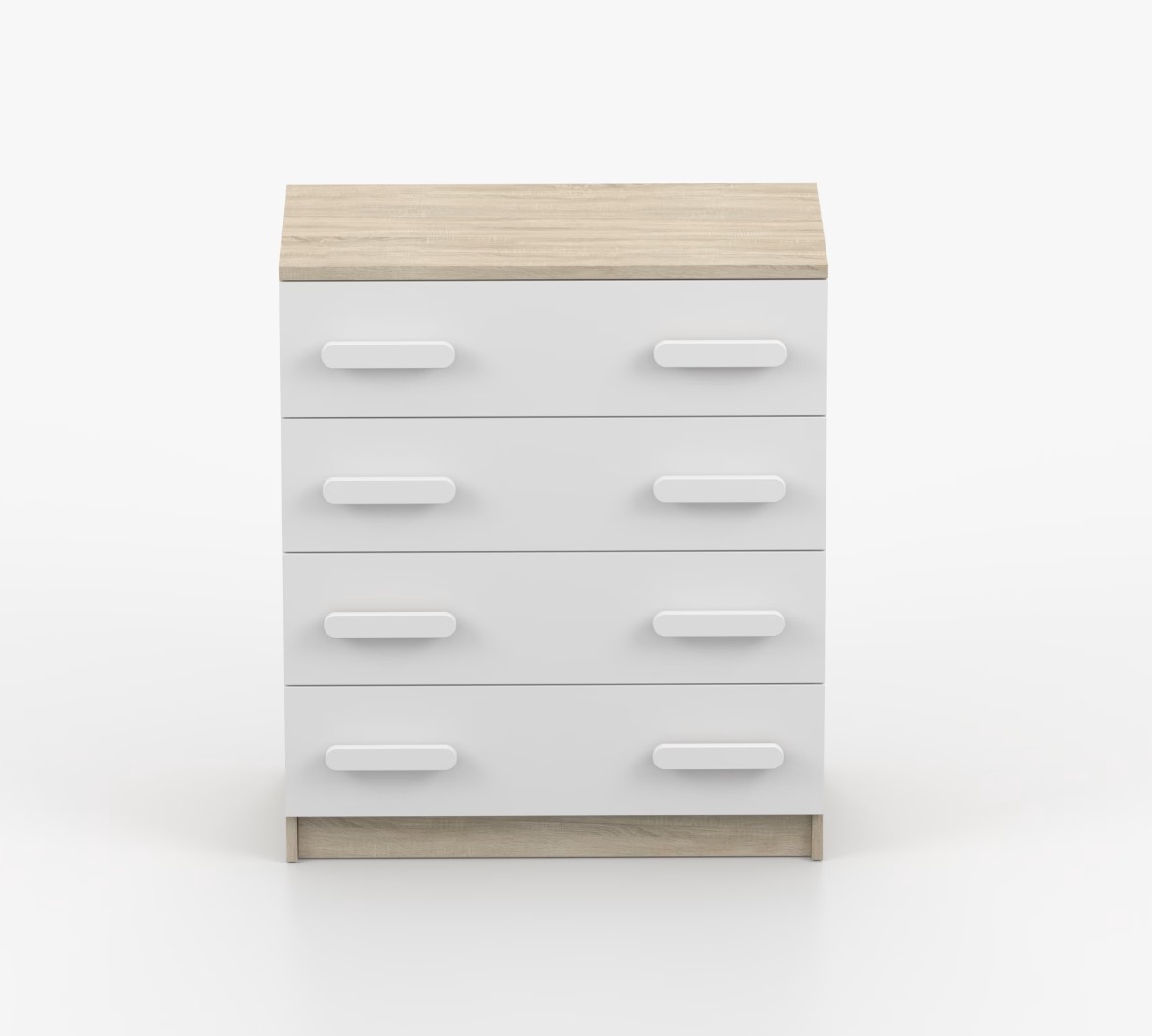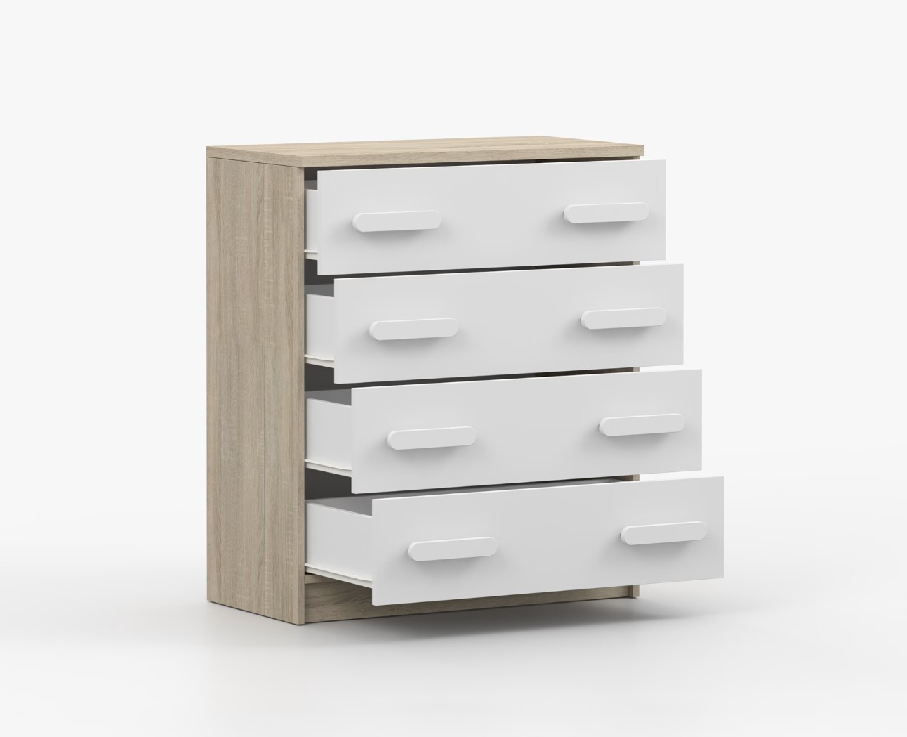Komoda SCOUT je praktický kus nábytku s moderným dizajnom, ktorý sa ľahko začlení do akéhokoľvek interiéru. Štyri priestranné zásuvky s farebnými úchytkami poskytujú dostatok úložného priestoru. Komoda je vyrobená z kvalitnej laminovanej dosky s hrúbkou 16 mm, ktorá je odolná proti poškriabaniu, poškodeniu, vlhkosti a vysokým teplotám. Hrany sú zakončené ABS lištou, čo zaisťuje ich odolnosť a pevnosť.