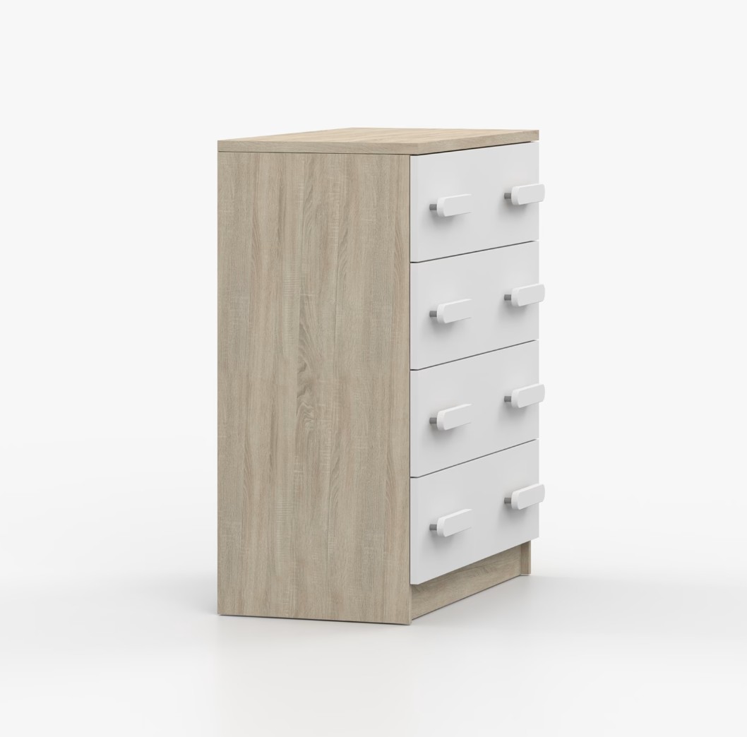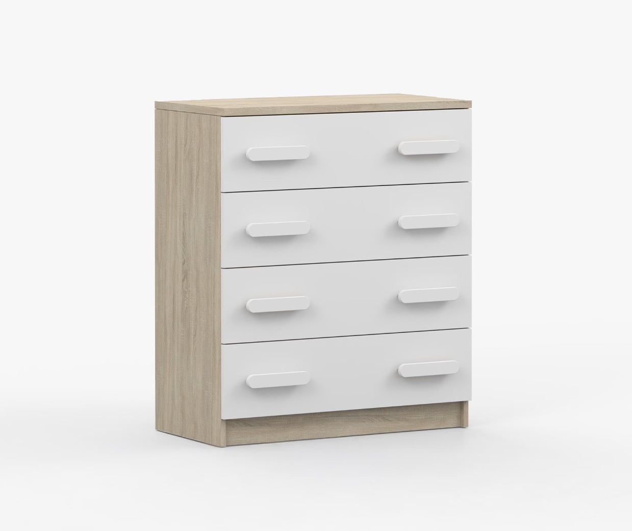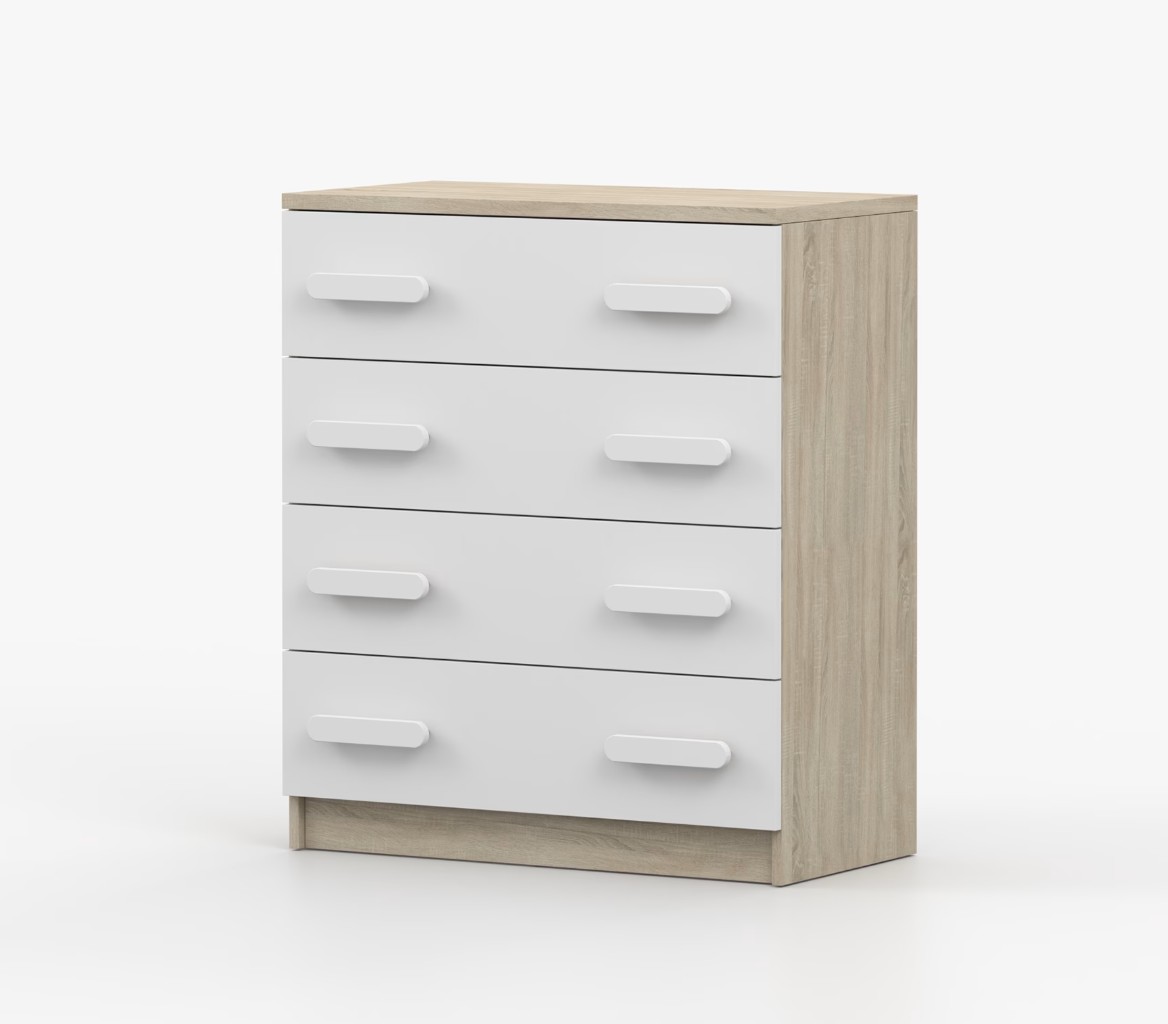 Komoda SCOUT je praktický kus nábytku s moderným dizajnom, ktorý sa ľahko začlení do akéhokoľvek interiéru. Štyri priestranné zásuvky s farebnými úchytkami poskytujú dostatok úložného priestoru. Komoda je vyrobená z kvalitnej laminovanej dosky s hrúbkou 16 mm, ktorá je odolná proti poškriabaniu, poškodeniu, vlhkosti a vysokým teplotám. Hrany sú zakončené ABS lištou, čo zaisťuje ich odolnosť a pevnosť.