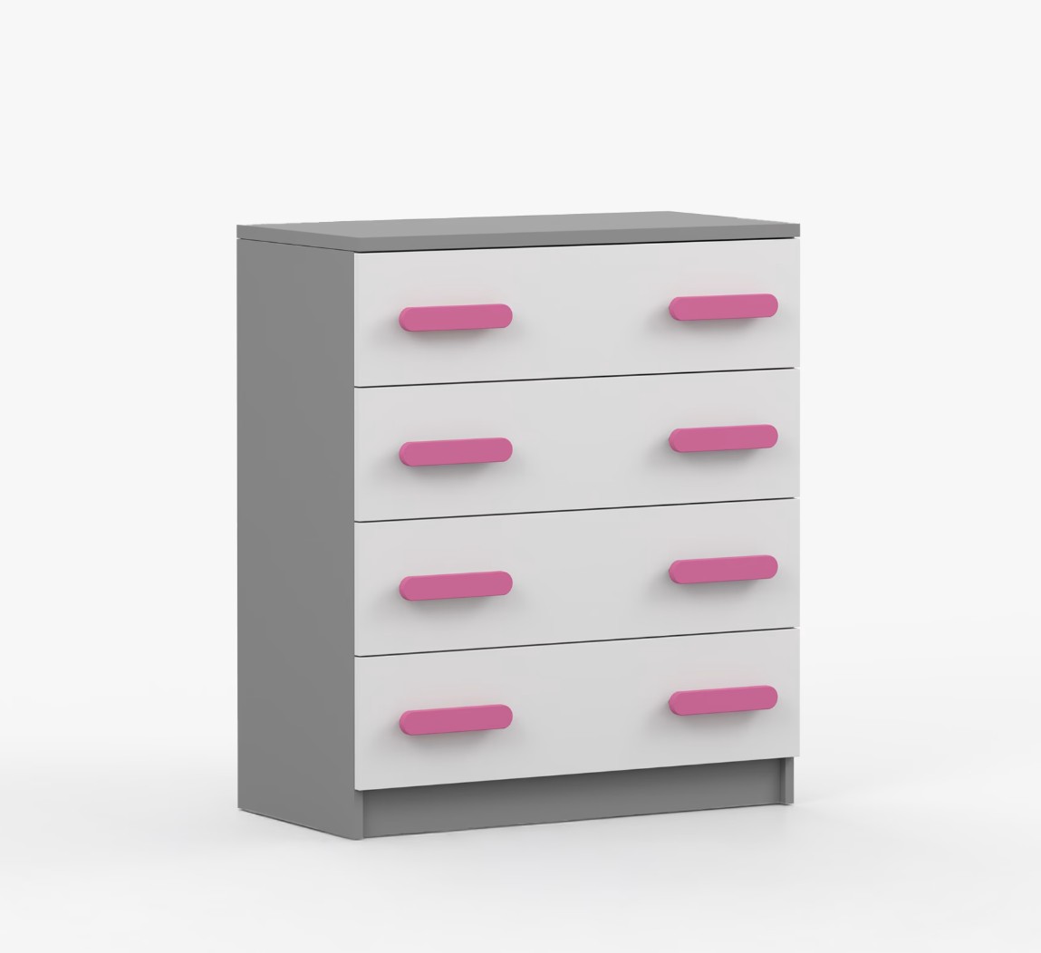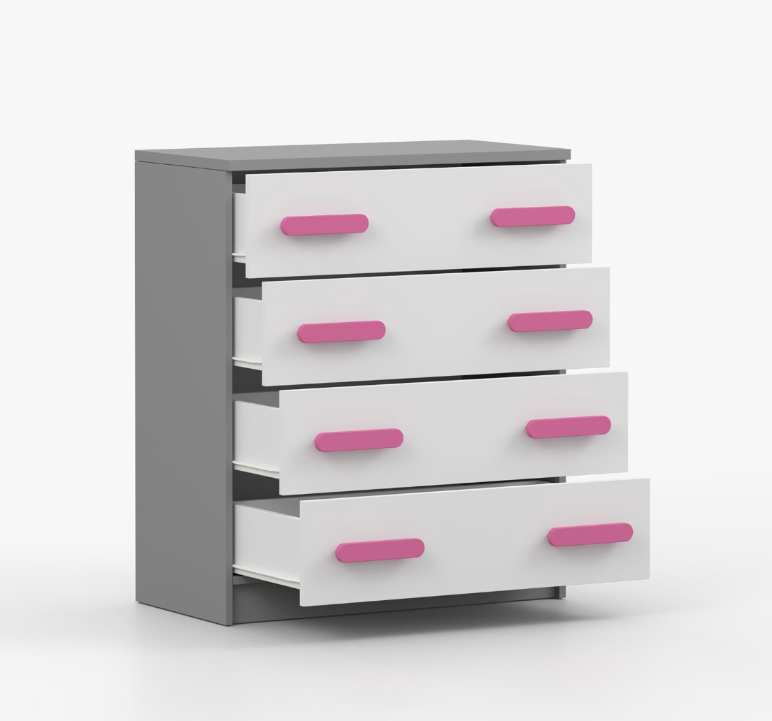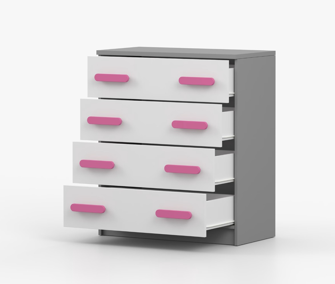 Komoda SCOUT je praktický kus nábytku s moderným dizajnom, ktorý sa ľahko začlení do akéhokoľvek interiéru. Štyri priestranné zásuvky s farebnými úchytkami poskytujú dostatok úložného priestoru. Komoda je vyrobená z kvalitnej laminovanej dosky s hrúbkou 16 mm, ktorá je odolná proti poškriabaniu, poškodeniu, vlhkosti a vysokým teplotám. Hrany sú zakončené ABS lištou, čo zaisťuje ich odolnosť a pevnosť.