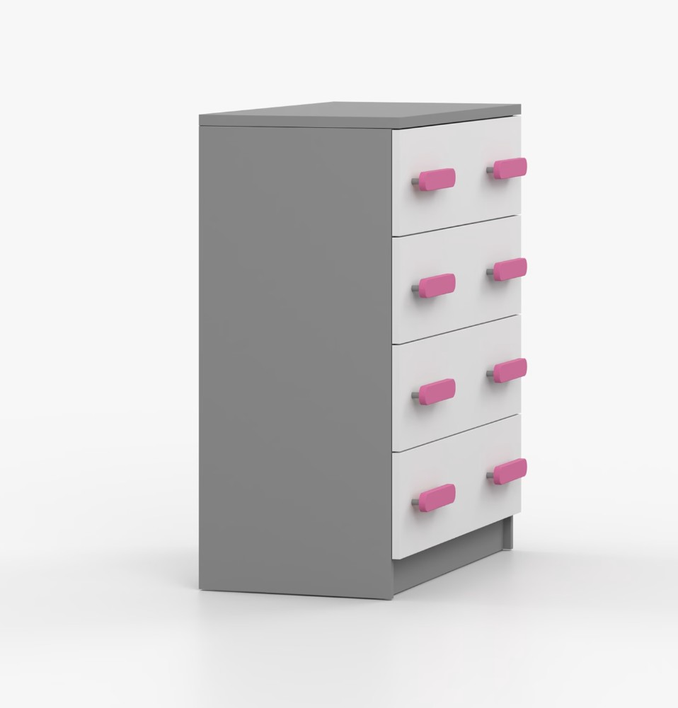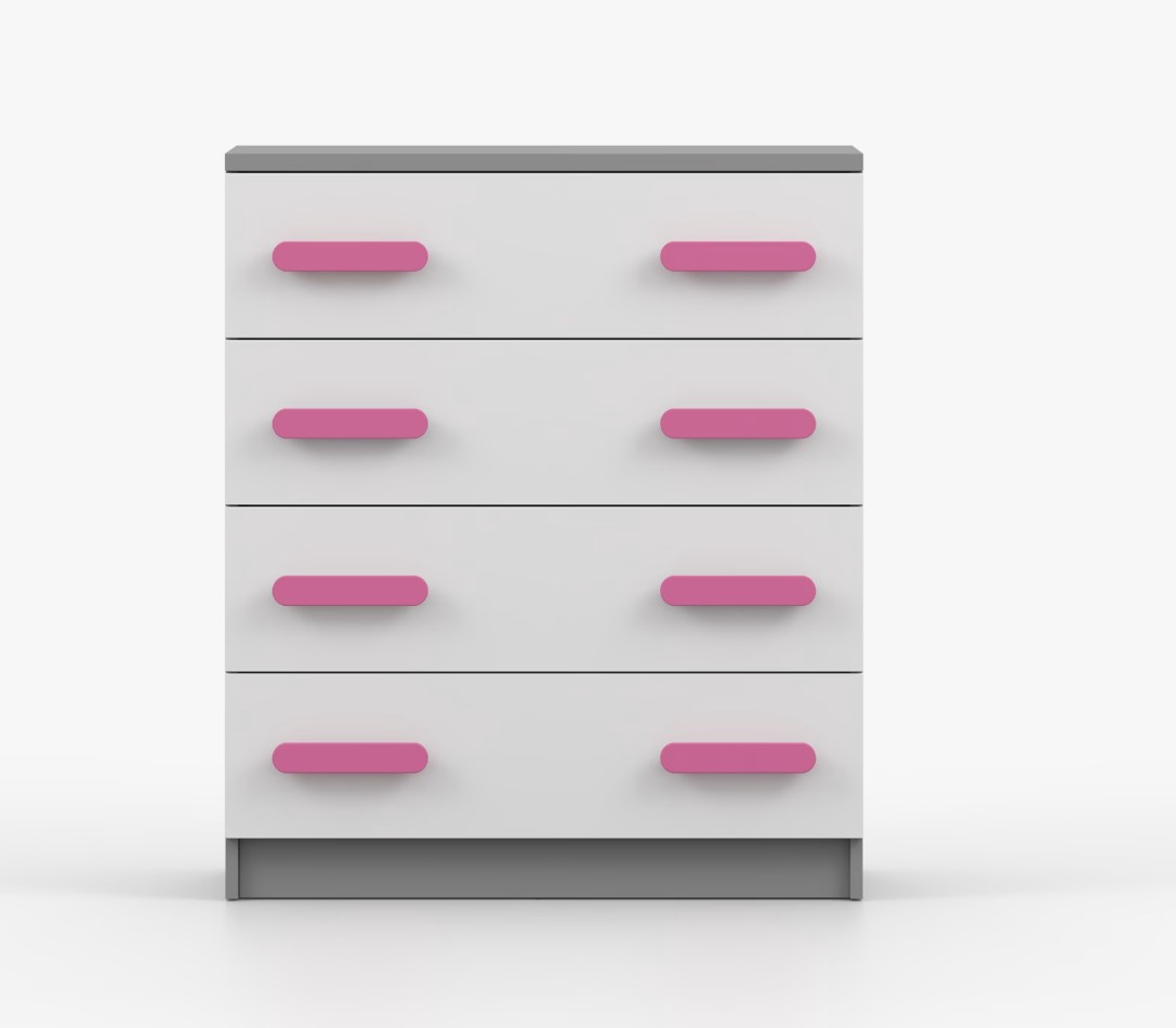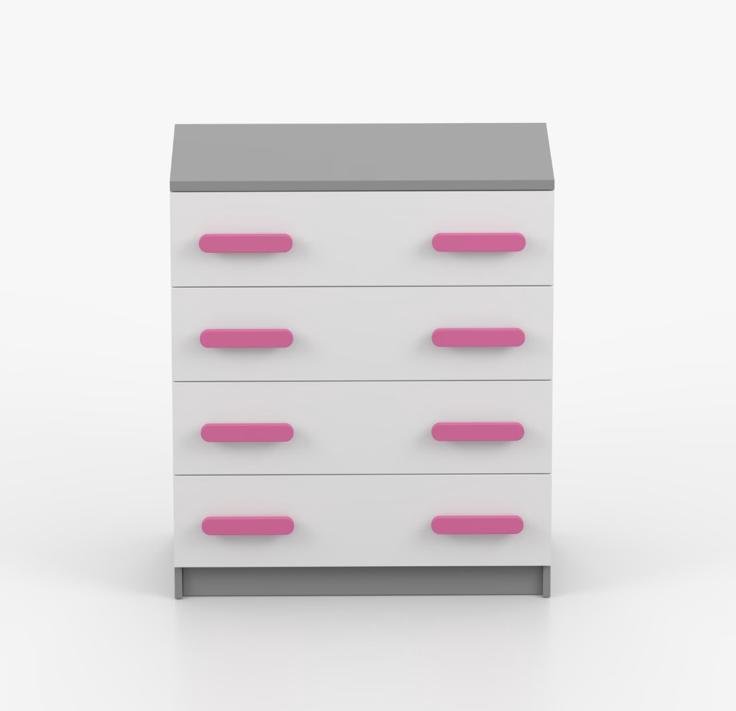 Komoda SCOUT je praktický kus nábytku s moderným dizajnom, ktorý sa ľahko začlení do akéhokoľvek interiéru. Štyri priestranné zásuvky s farebnými úchytkami poskytujú dostatok úložného priestoru. Komoda je vyrobená z kvalitnej laminovanej dosky s hrúbkou 16 mm, ktorá je odolná proti poškriabaniu, poškodeniu, vlhkosti a vysokým teplotám. Hrany sú zakončené ABS lištou, čo zaisťuje ich odolnosť a pevnosť.