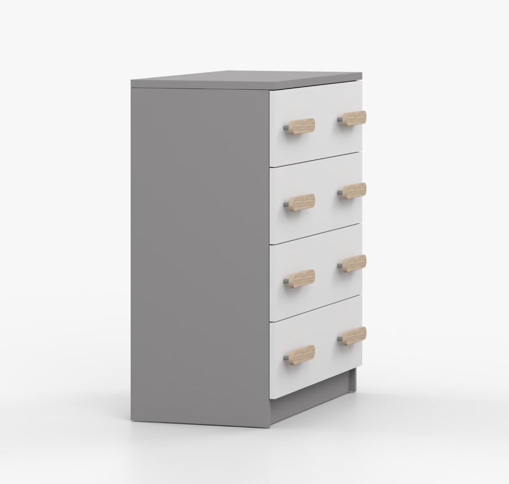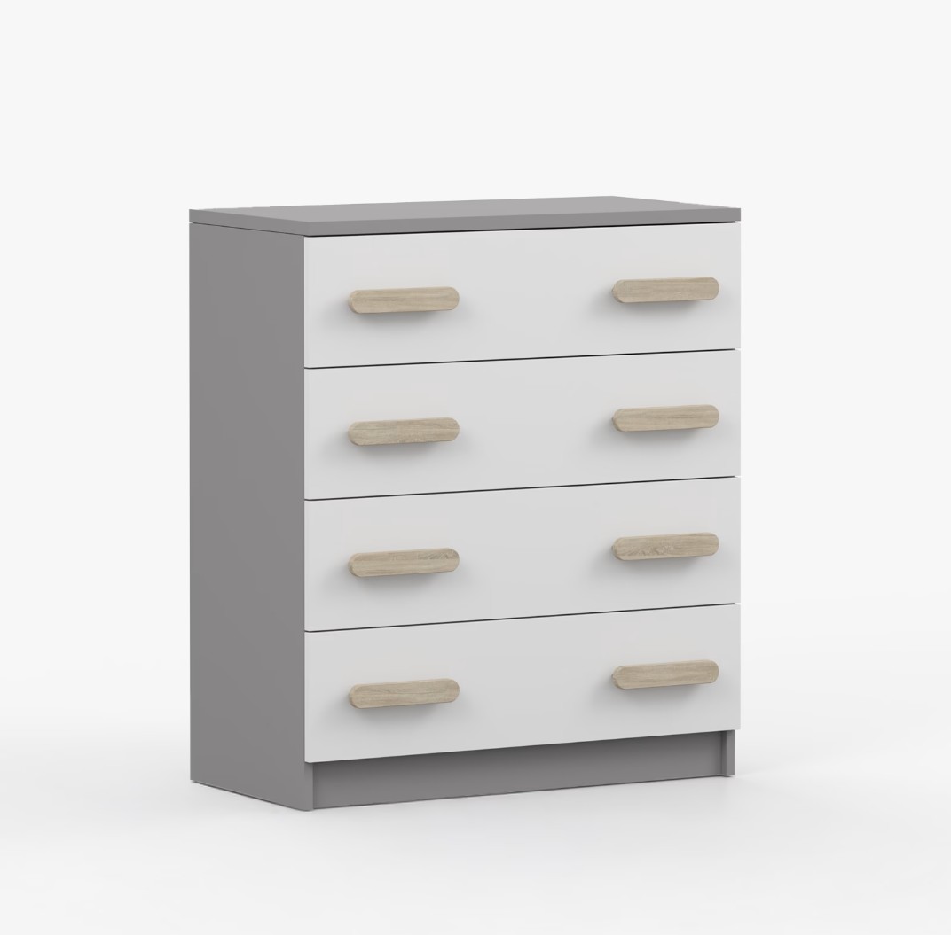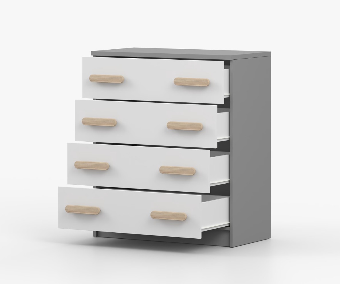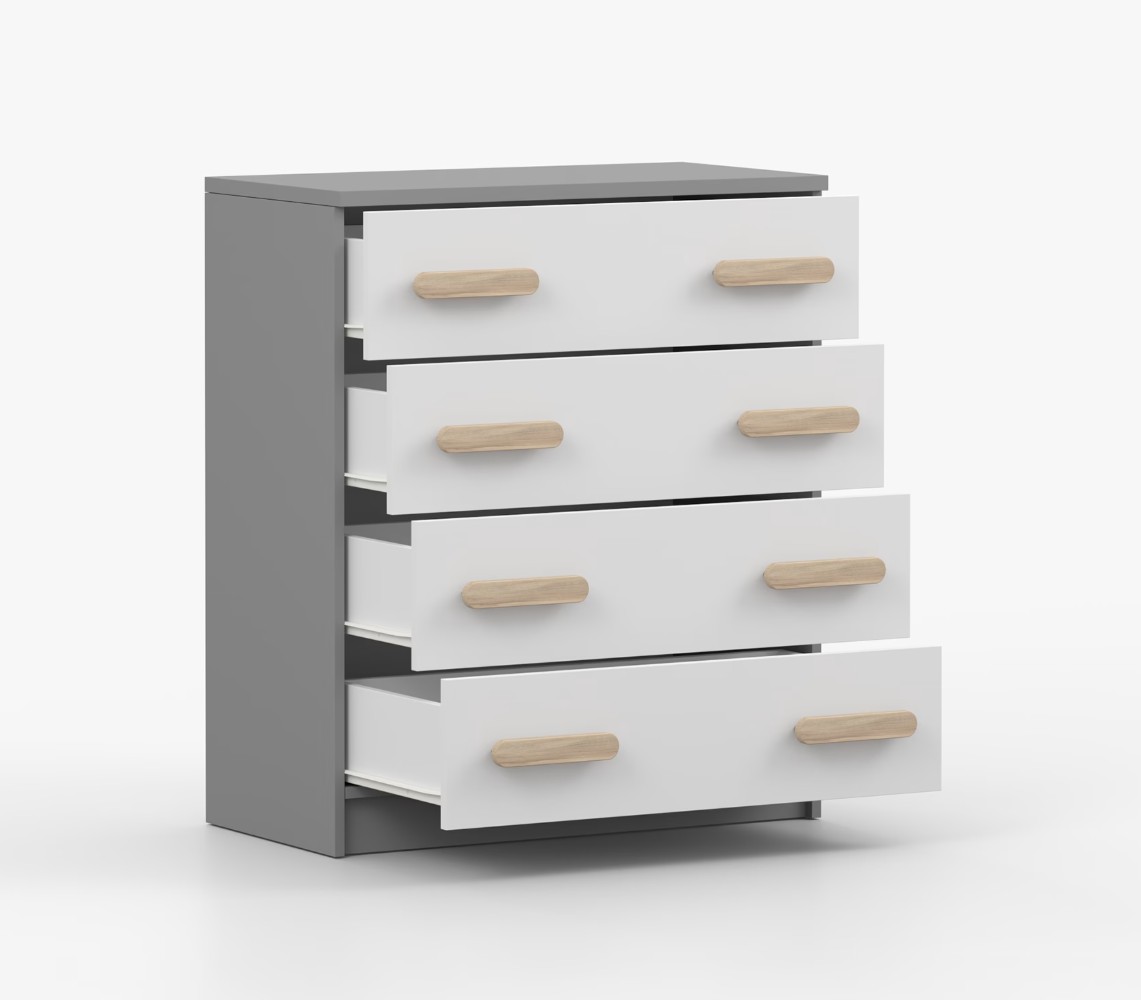 Komoda SCOUT je praktický kus nábytku s moderným dizajnom, ktorý sa ľahko začlení do akéhokoľvek interiéru. Štyri priestranné zásuvky s farebnými úchytkami poskytujú dostatok úložného priestoru. Komoda je vyrobená z kvalitnej laminovanej dosky s hrúbkou 16 mm, ktorá je odolná proti poškriabaniu, poškodeniu, vlhkosti a vysokým teplotám. Hrany sú zakončené ABS lištou, čo zaisťuje ich odolnosť a pevnosť.