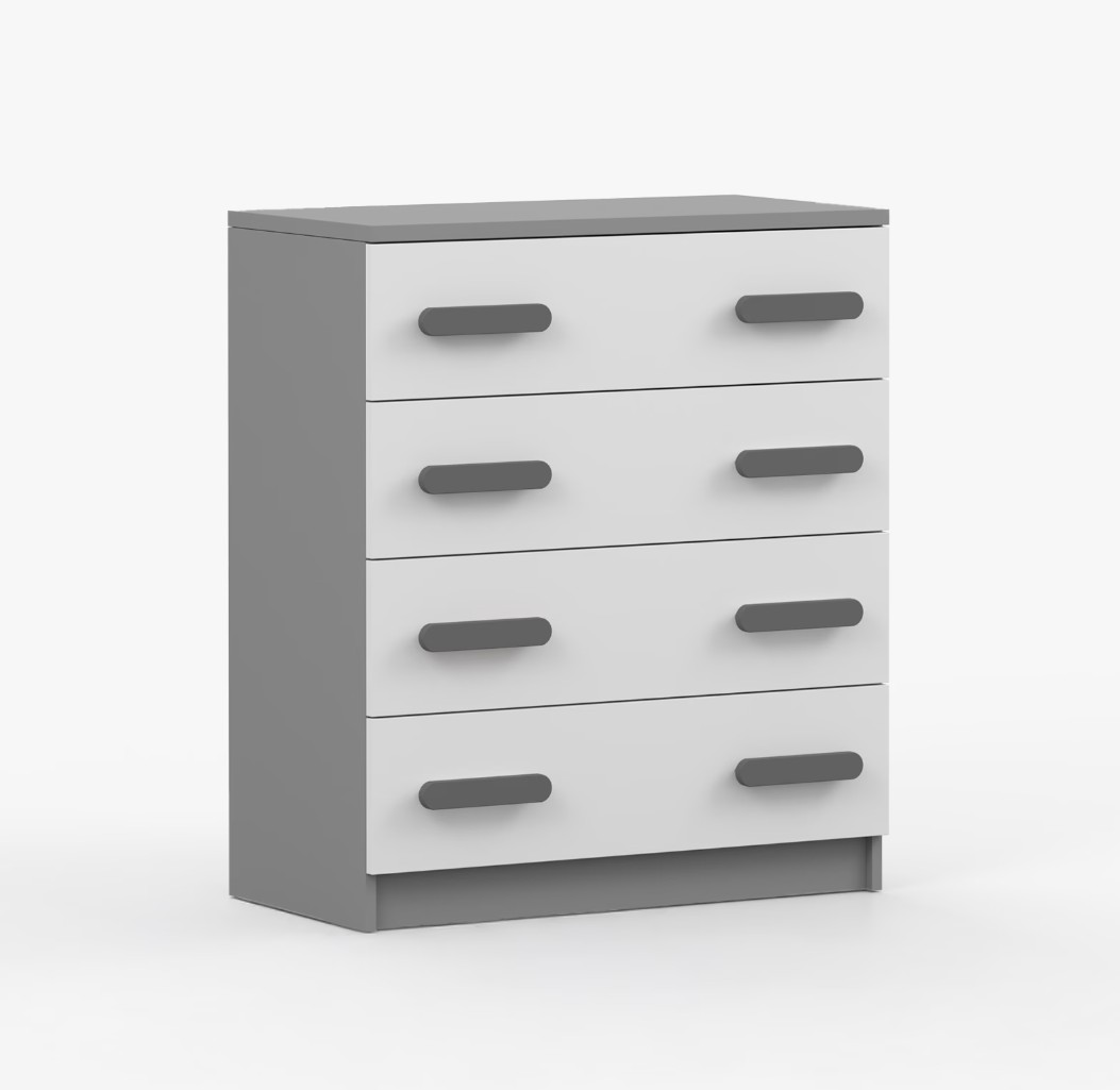 Komoda SCOUT je praktický kus nábytku s moderným dizajnom, ktorý sa ľahko začlení do akéhokoľvek interiéru. Štyri priestranné zásuvky s farebnými úchytkami poskytujú dostatok úložného priestoru. Komoda je vyrobená z kvalitnej laminovanej dosky s hrúbkou 16 mm, ktorá je odolná proti poškriabaniu, poškodeniu, vlhkosti a vysokým teplotám. Hrany sú zakončené ABS lištou, čo zaisťuje ich odolnosť a pevnosť.