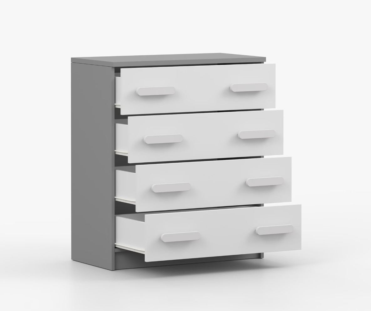 Komoda SCOUT je praktický kus nábytku s moderným dizajnom, ktorý sa ľahko začlení do akéhokoľvek interiéru. Štyri priestranné zásuvky s farebnými úchytkami poskytujú dostatok úložného priestoru. Komoda je vyrobená z kvalitnej laminovanej dosky s hrúbkou 16 mm, ktorá je odolná proti poškriabaniu, poškodeniu, vlhkosti a vysokým teplotám. Hrany sú zakončené ABS lištou, čo zaisťuje ich odolnosť a pevnosť.