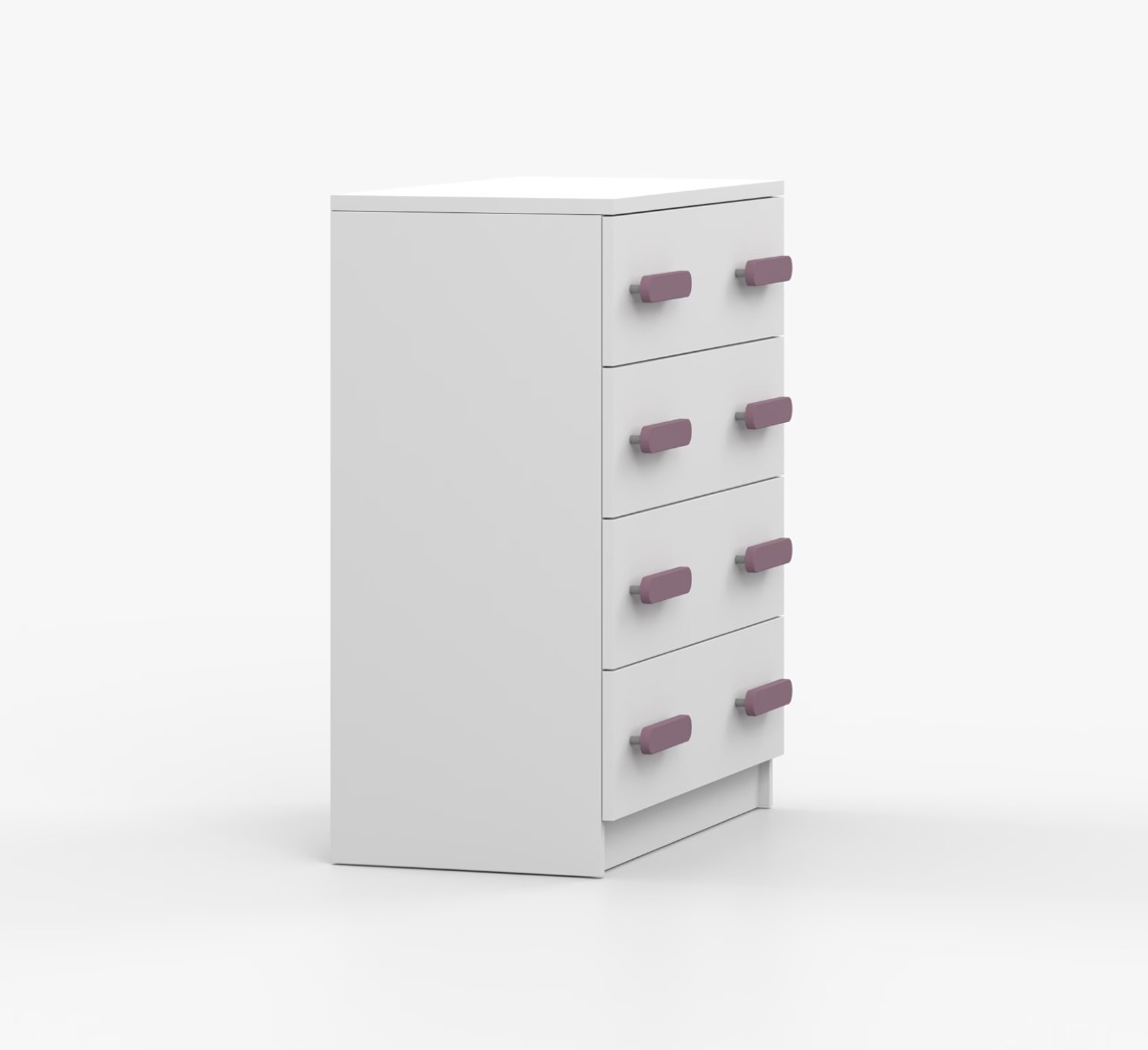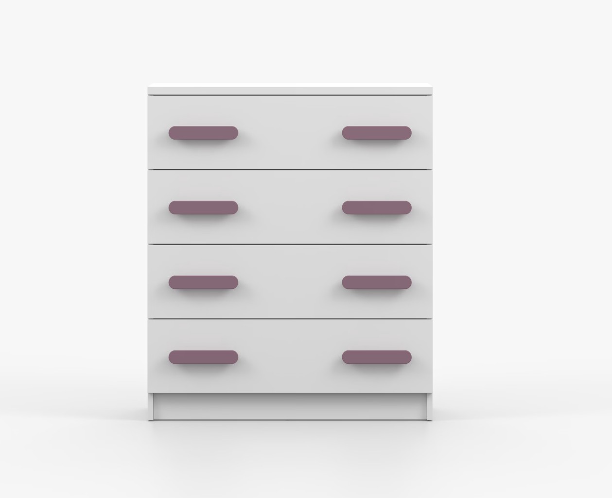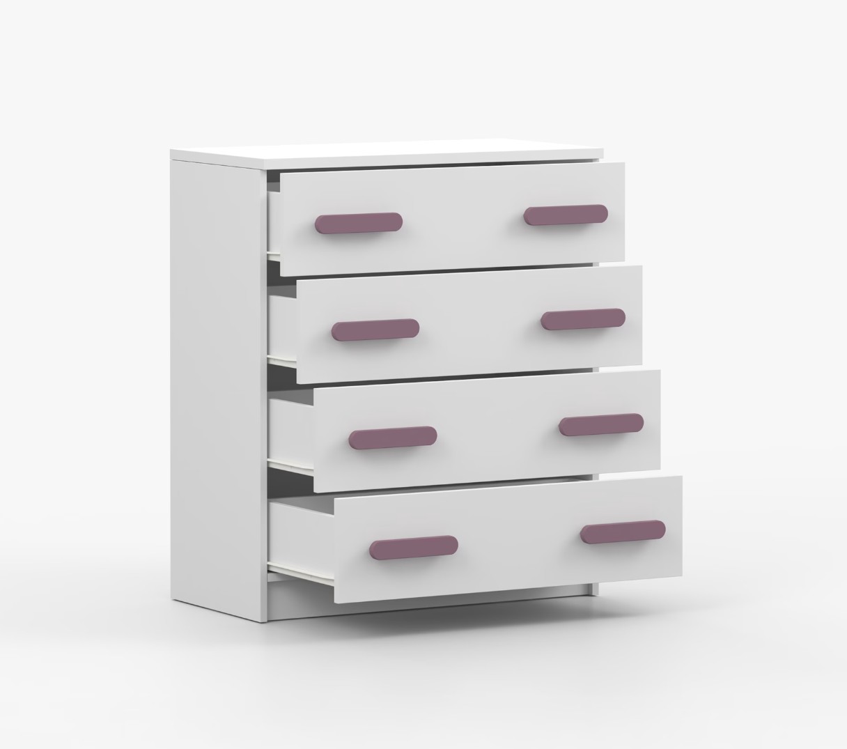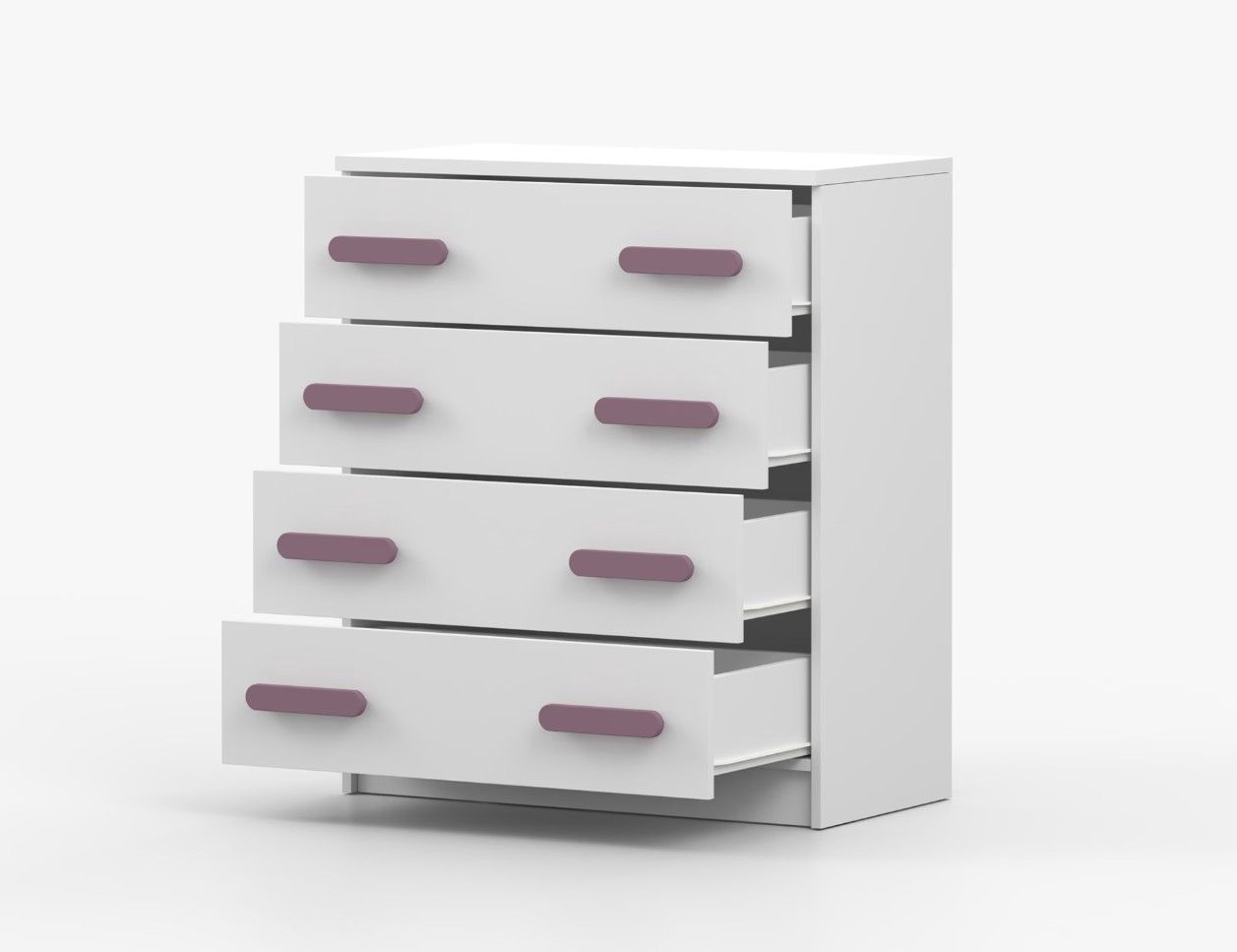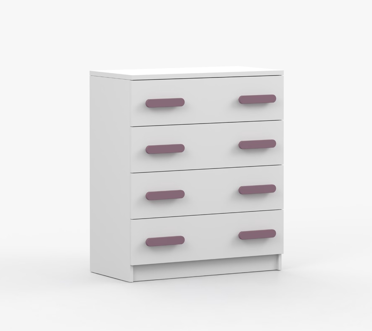 Komoda SMYK je praktický kus nábytku s moderným dizajnom, ktorý sa ľahko začlení do akéhokoľvek interiéru. Štyri priestranné zásuvky s farebnými úchytkami poskytujú dostatok úložného priestoru. Komoda je vyrobená z kvalitnej laminovanej dosky s hrúbkou 16 mm, ktorá je odolná proti poškriabaniu, poškodeniu, vlhkosti a vysokým teplotám. Hrany sú zakončené ABS lištou, čo zaisťuje ich odolnosť a pevnosť.