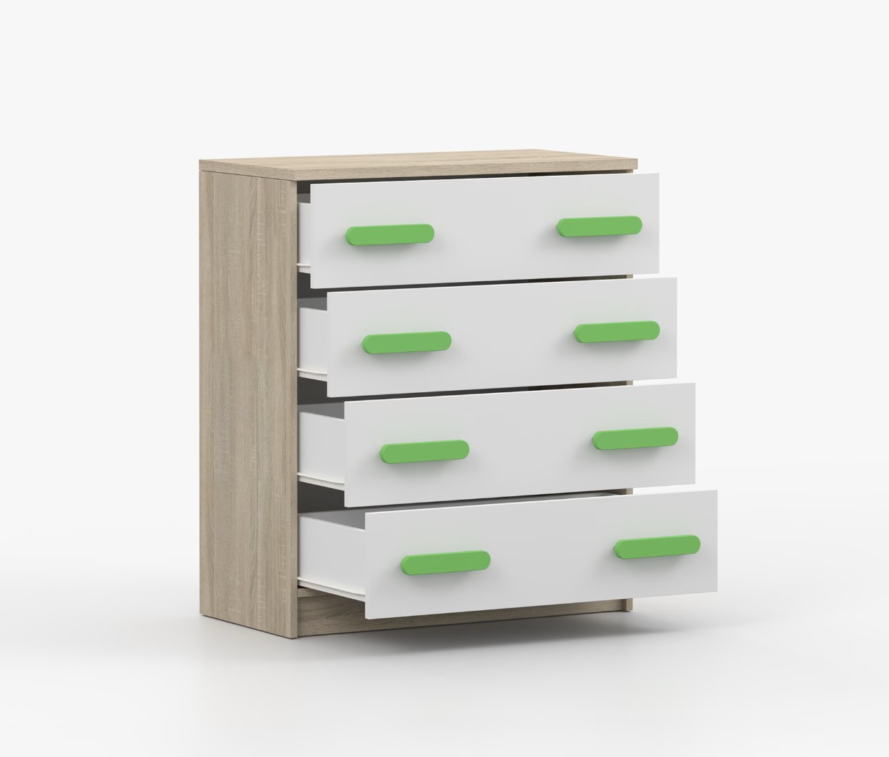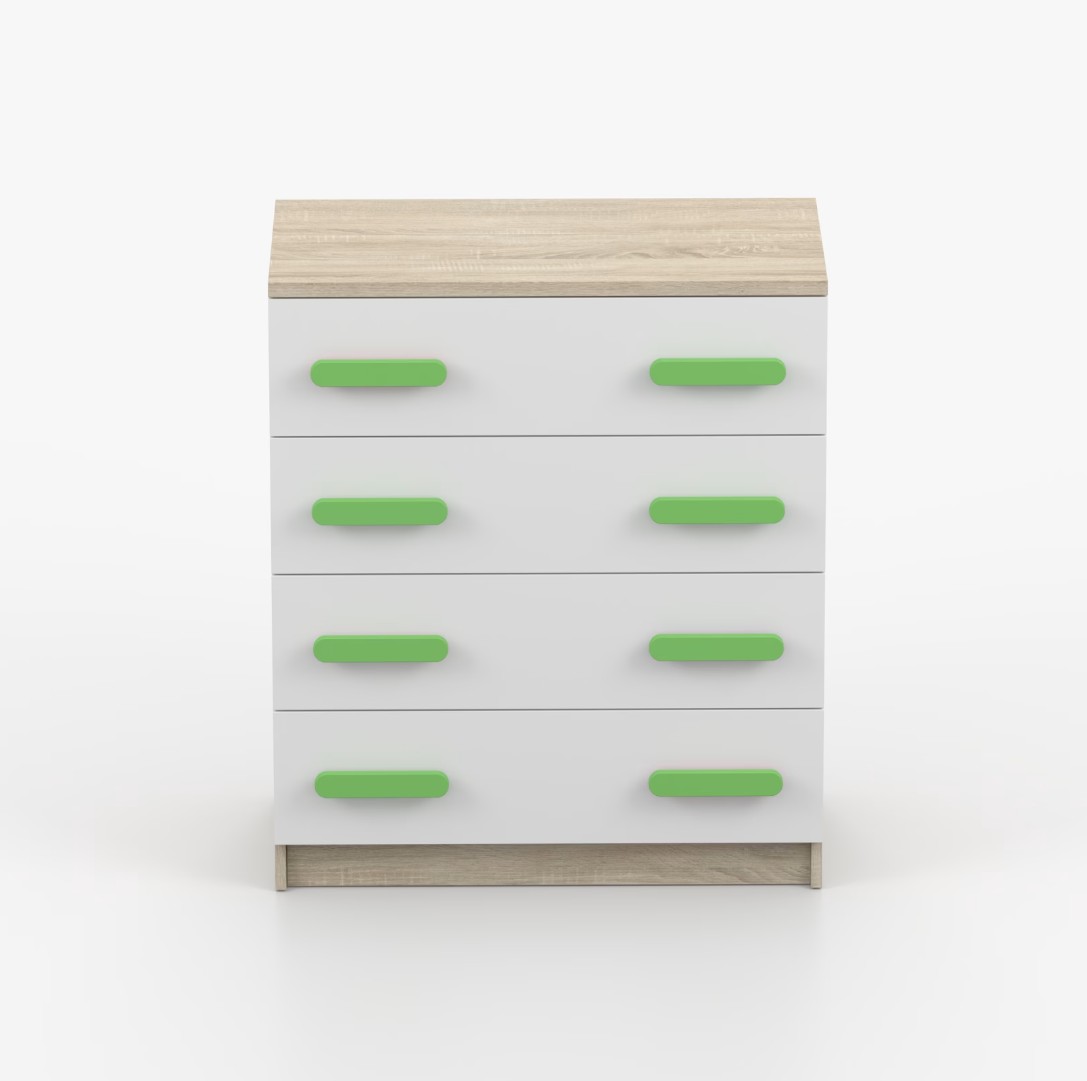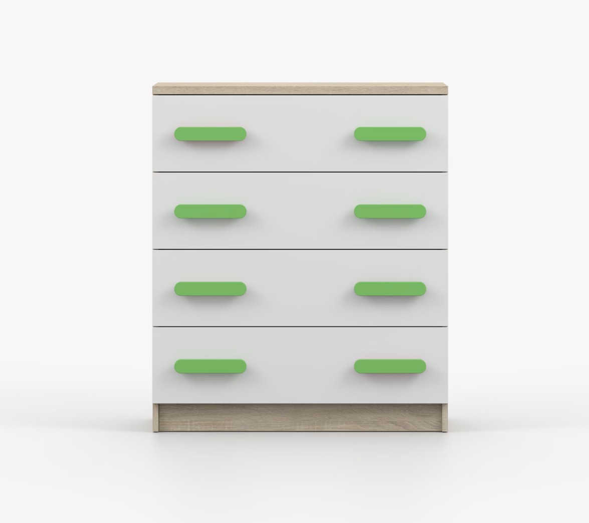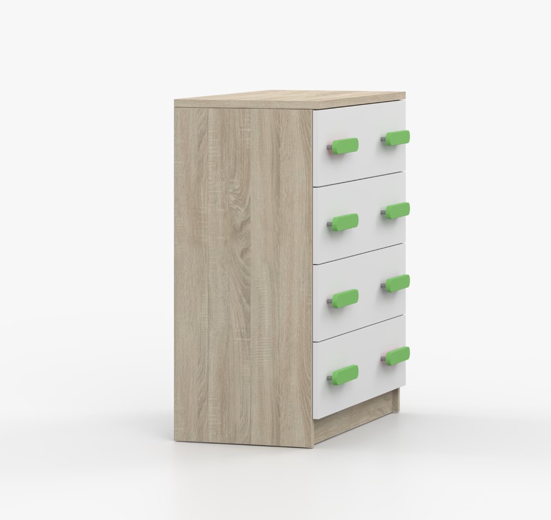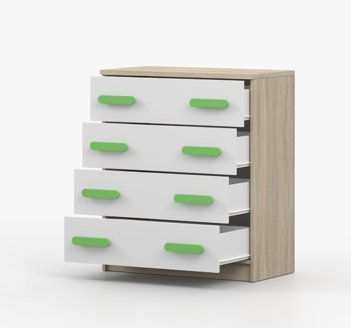 Komoda SMYK je praktický kus nábytku s moderným dizajnom, ktorý sa ľahko začlení do akéhokoľvek interiéru. Štyri priestranné zásuvky s farebnými úchytkami poskytujú dostatok úložného priestoru. Komoda je vyrobená z kvalitnej laminovanej dosky s hrúbkou 16 mm, ktorá je odolná proti poškriabaniu, poškodeniu, vlhkosti a vysokým teplotám. Hrany sú zakončené ABS lištou, čo zaisťuje ich odolnosť a pevnosť.