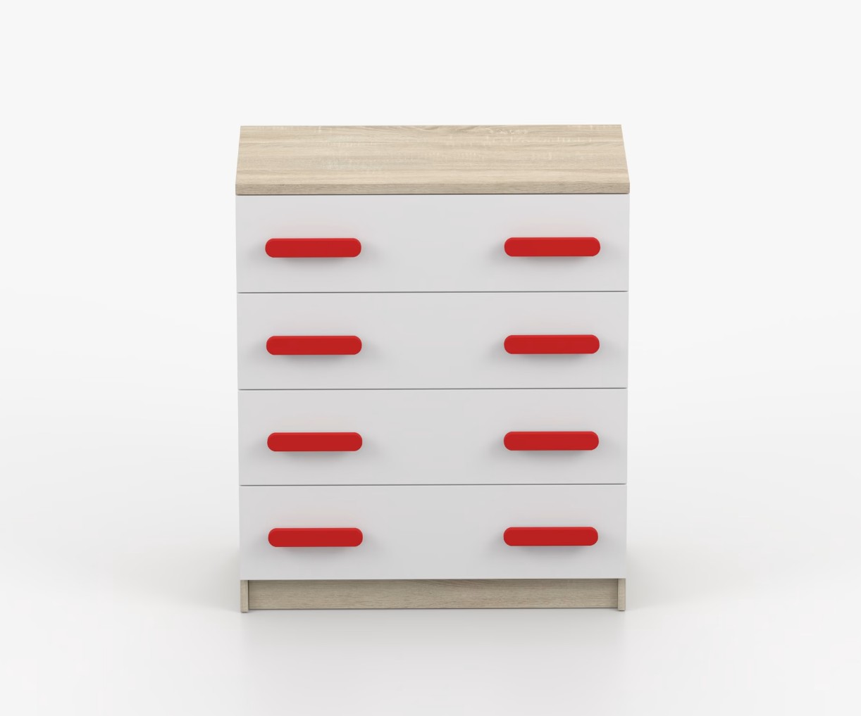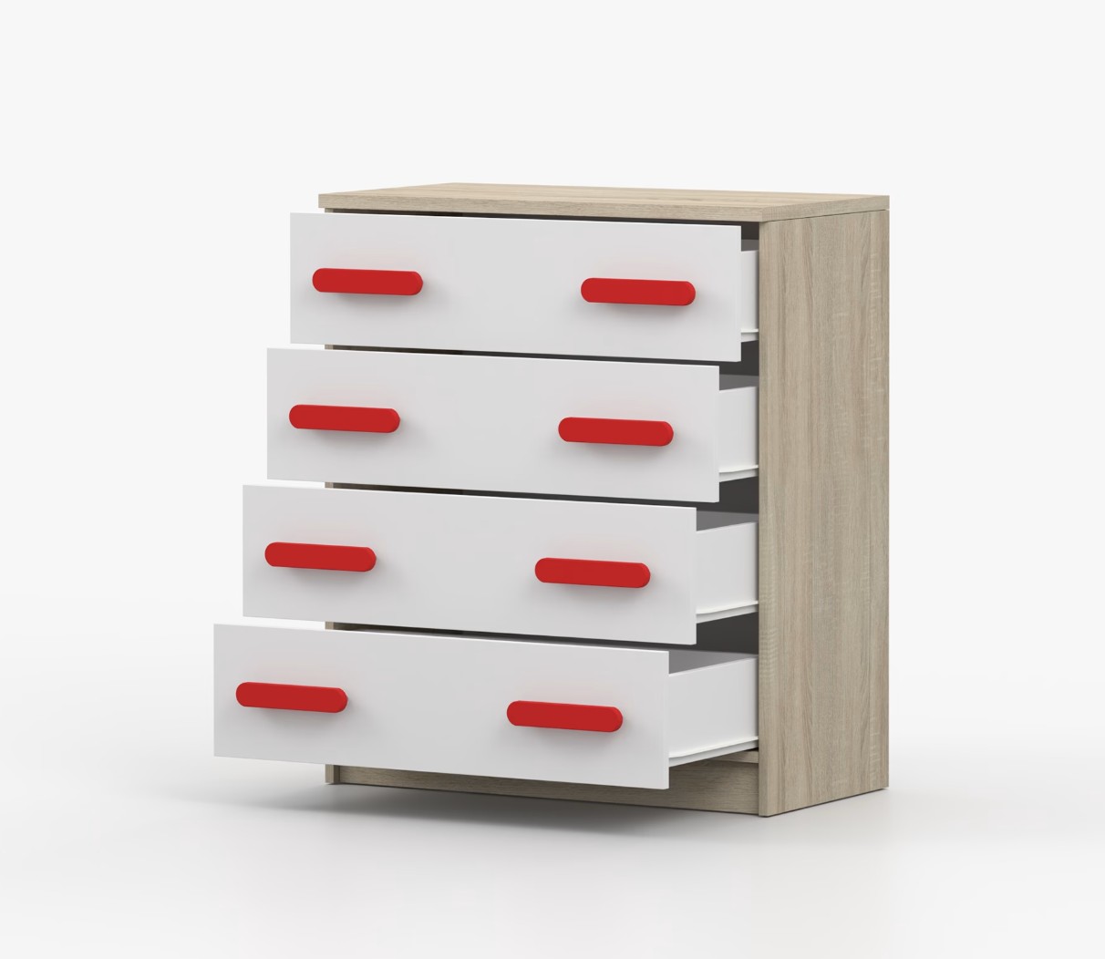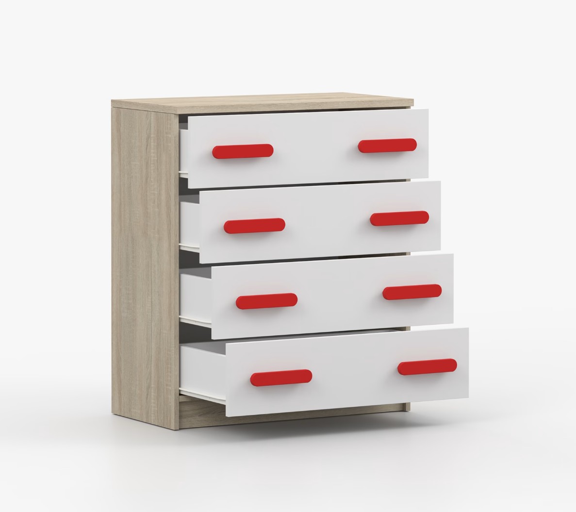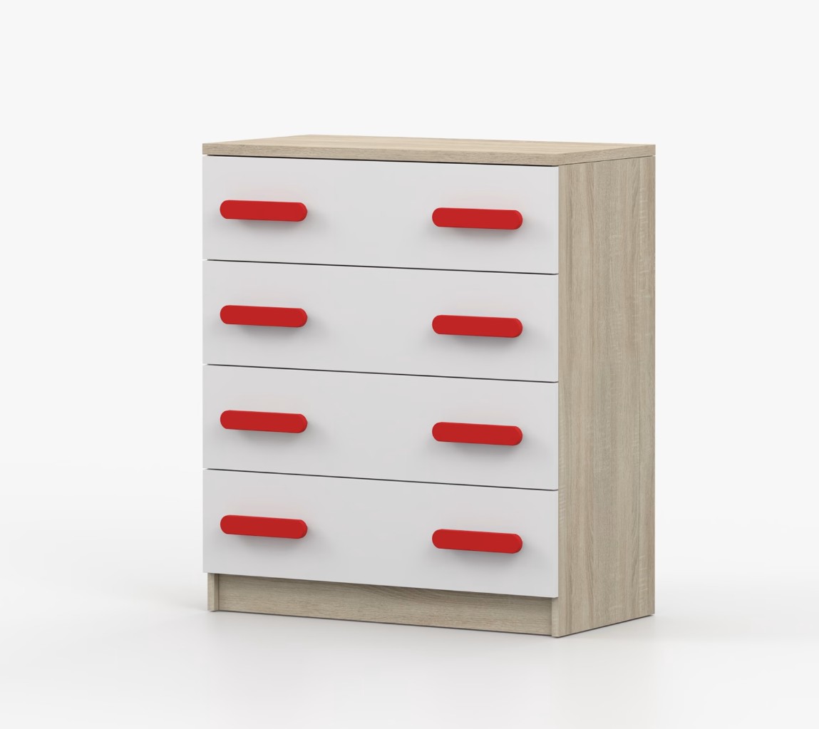Komoda SMYK je praktický kus nábytku s moderným dizajnom, ktorý sa ľahko začlení do akéhokoľvek interiéru. Štyri priestranné zásuvky s farebnými úchytkami poskytujú dostatok úložného priestoru. Komoda je vyrobená z kvalitnej laminovanej dosky s hrúbkou 16 mm, ktorá je odolná proti poškriabaniu, poškodeniu, vlhkosti a vysokým teplotám. Hrany sú zakončené ABS lištou, čo zaisťuje ich odolnosť a pevnosť.