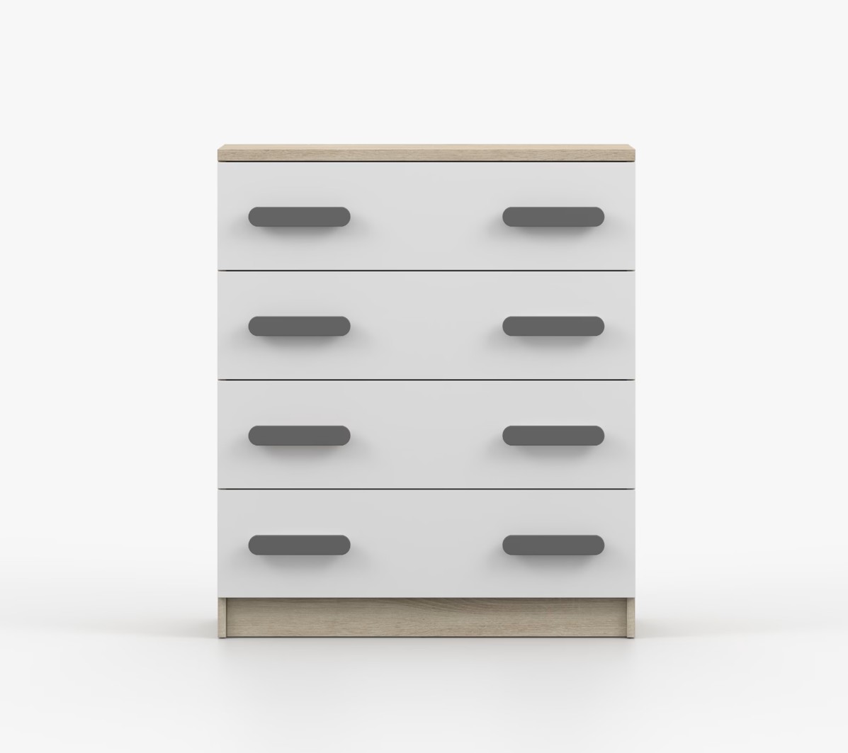Komoda SMYK je praktický kus nábytku s moderným dizajnom, ktorý sa ľahko začlení do akéhokoľvek interiéru. Štyri priestranné zásuvky s farebnými úchytkami poskytujú dostatok úložného priestoru. Komoda je vyrobená z kvalitnej laminovanej dosky s hrúbkou 16 mm, ktorá je odolná proti poškriabaniu, poškodeniu, vlhkosti a vysokým teplotám. Hrany sú zakončené ABS lištou, čo zaisťuje ich odolnosť a pevnosť.