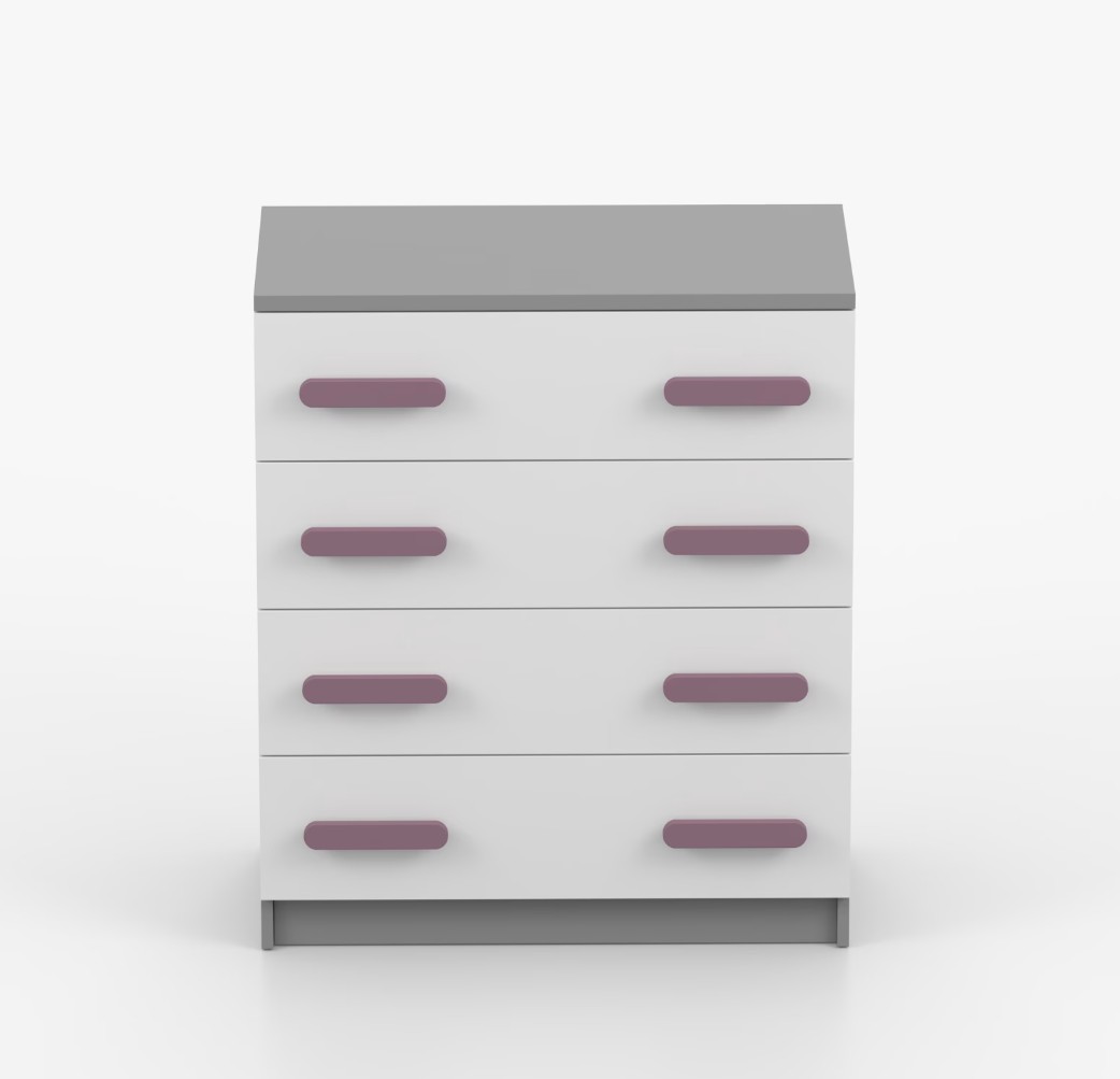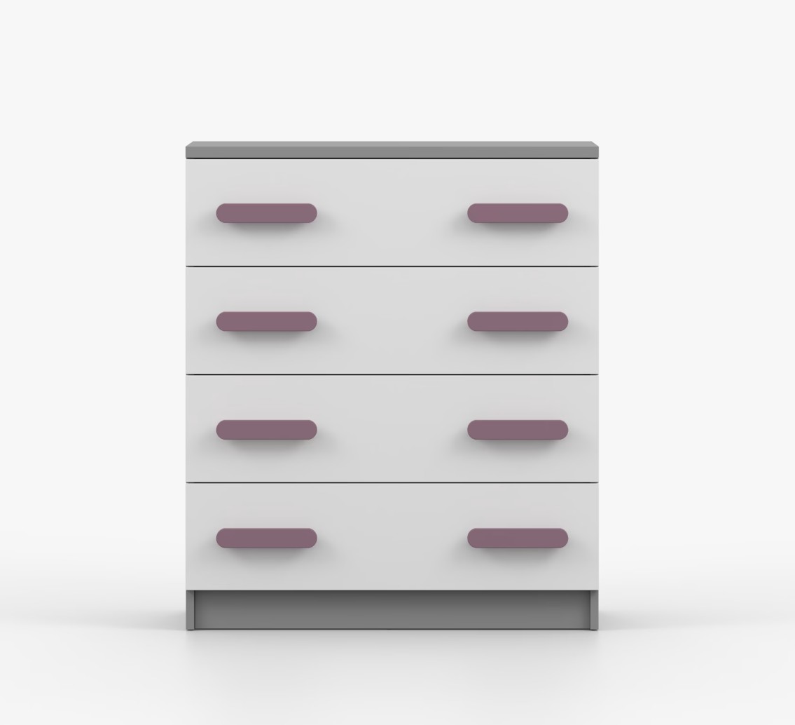 Komoda SMYK je praktický kus nábytku s moderným dizajnom, ktorý sa ľahko začlení do akéhokoľvek interiéru. Štyri priestranné zásuvky s farebnými úchytkami poskytujú dostatok úložného priestoru. Komoda je vyrobená z kvalitnej laminovanej dosky s hrúbkou 16 mm, ktorá je odolná proti poškriabaniu, poškodeniu, vlhkosti a vysokým teplotám. Hrany sú zakončené ABS lištou, čo zaisťuje ich odolnosť a pevnosť.