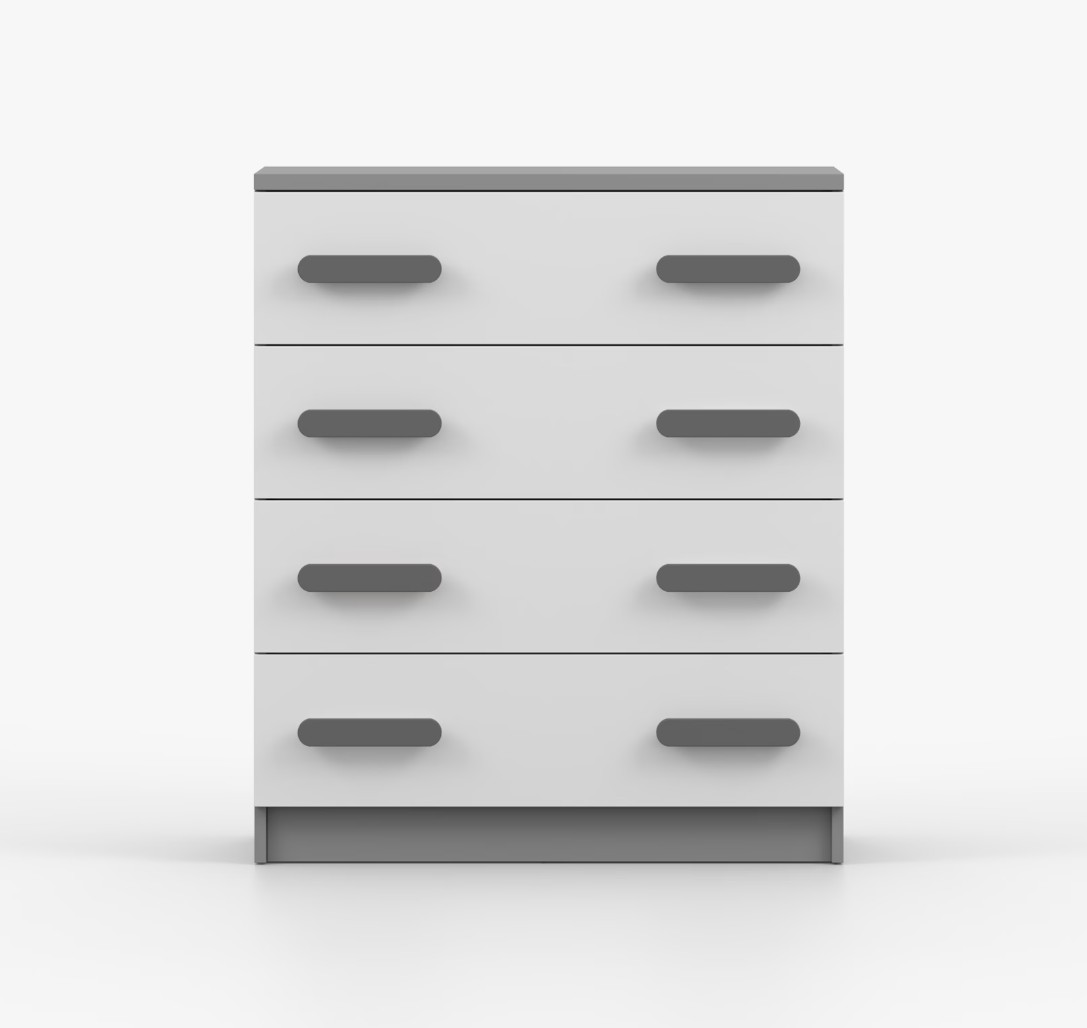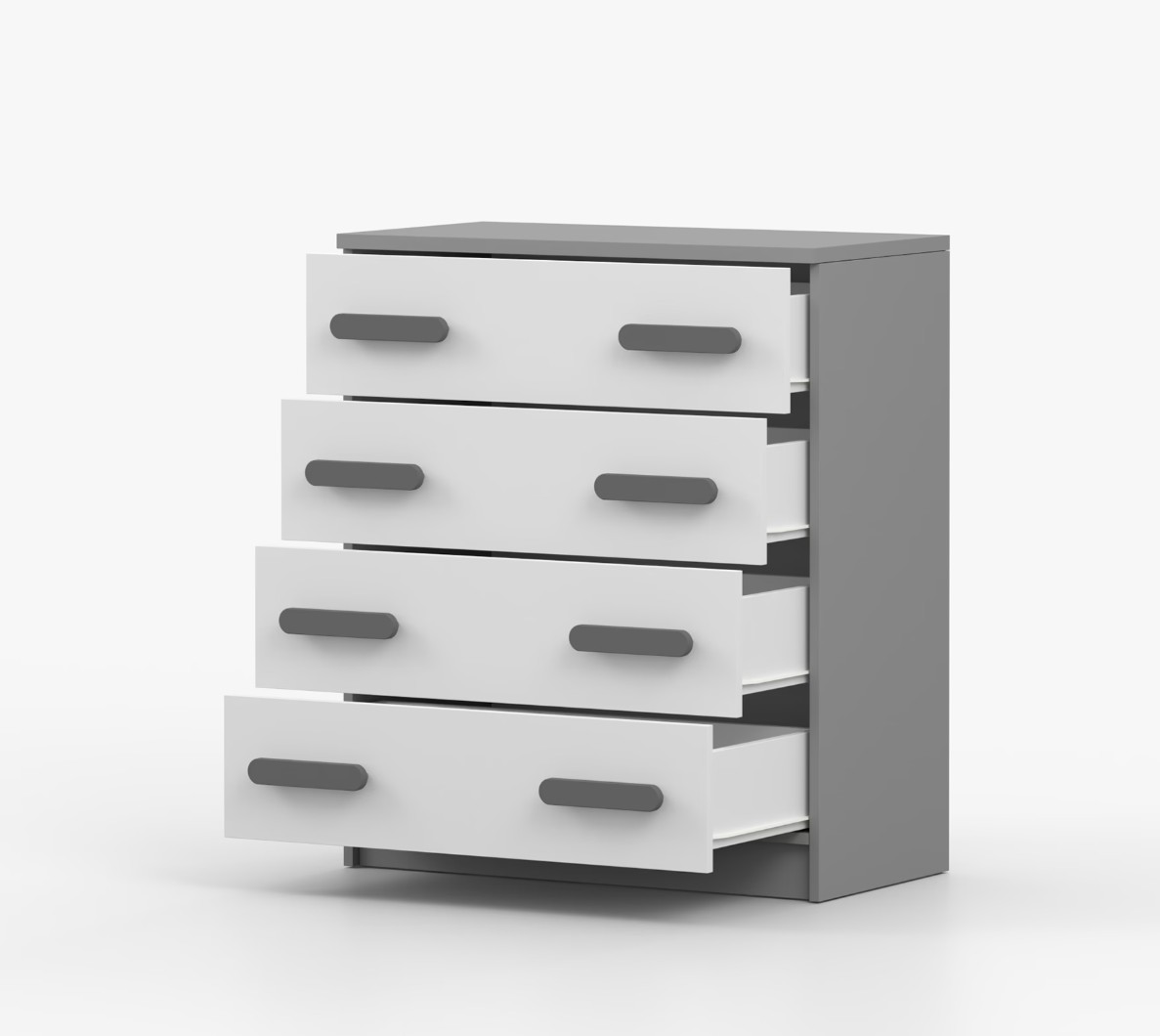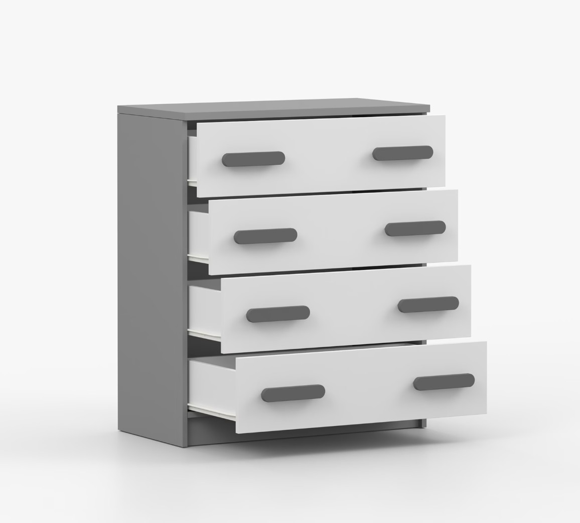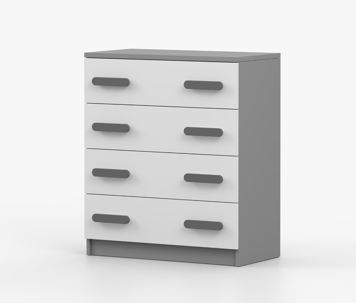 Komoda SMYK je praktický kus nábytku s moderným dizajnom, ktorý sa ľahko začlení do akéhokoľvek interiéru. Štyri priestranné zásuvky s farebnými úchytkami poskytujú dostatok úložného priestoru. Komoda je vyrobená z kvalitnej laminovanej dosky s hrúbkou 16 mm, ktorá je odolná proti poškriabaniu, poškodeniu, vlhkosti a vysokým teplotám. Hrany sú zakončené ABS lištou, čo zaisťuje ich odolnosť a pevnosť.