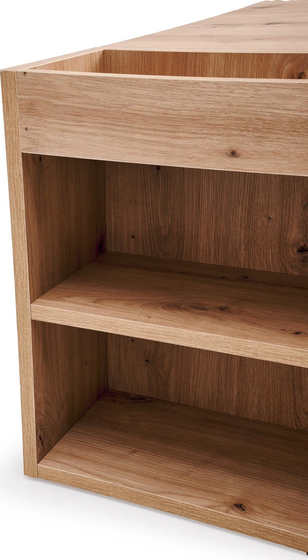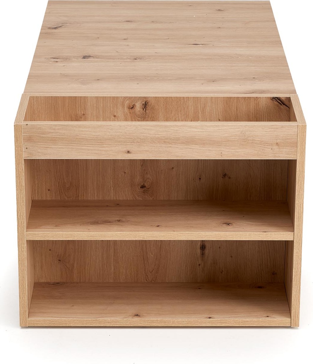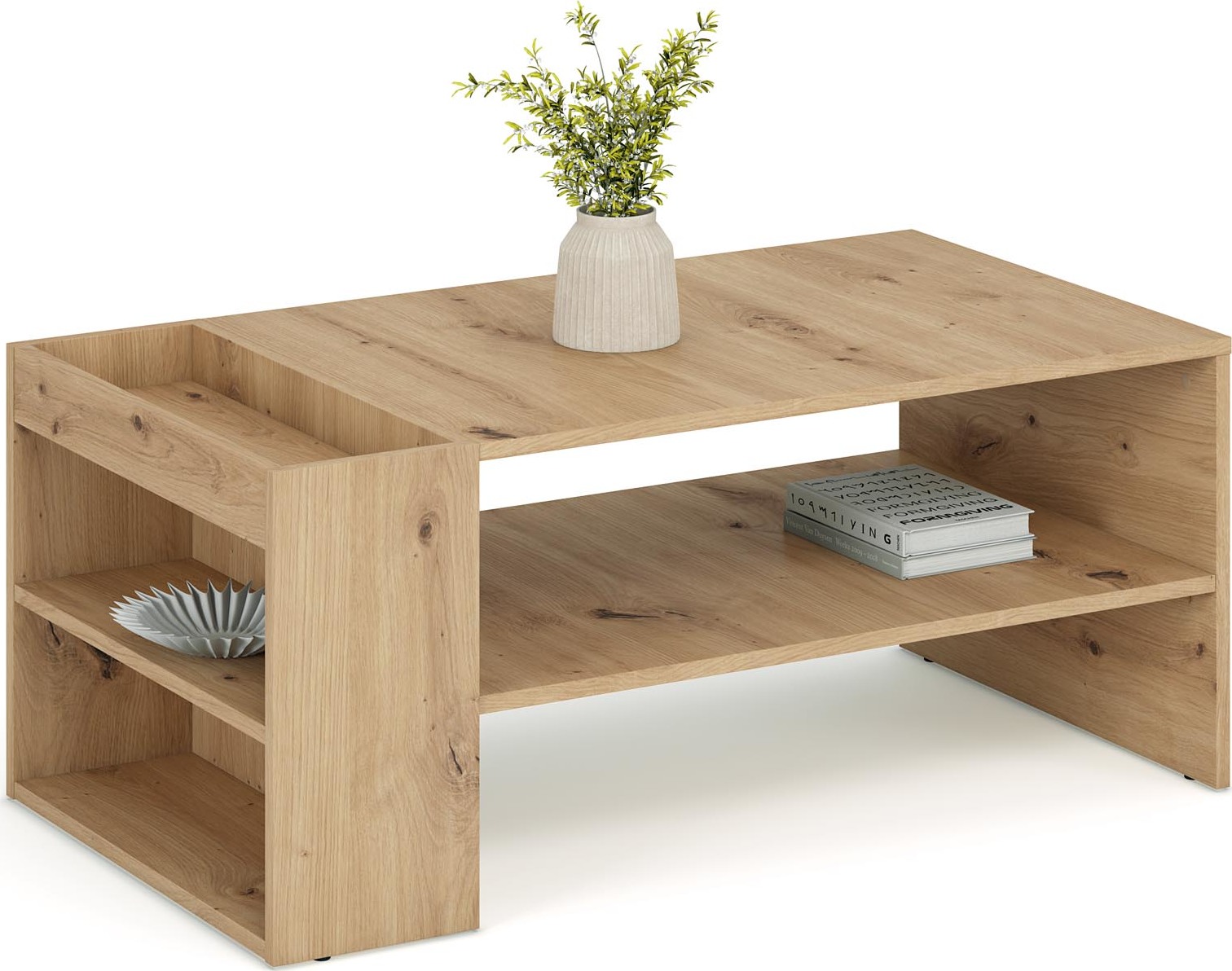 Jednoduchý a elegantný konferenčný stolík v modernom štýle sa hodí do každého interiéru. Tento konferenčný stolík vytvorí dostatočne veľký odkladací priestor. Stolík je vyrobený z laminovanej drevotrieskovej dosky, ktorá zaručuje odolnosť a pevnosť. Okladací priestor je vo forme hornej dosky, police a regálu na jednej strane stolíka.