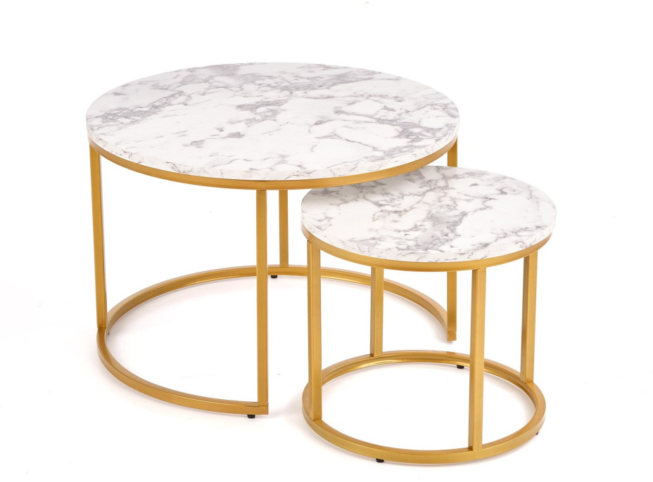 Súprava konferenčných stolíkov sa vyznačuje solídnym a detailným spracovaním. Vďaka univerzálnemu dizajnu sa stolíky budú hodiť do klasických aj modernejších interiérov, ktoré nielen obohatia, ale dodajú im aj originalitu. Na výrobu stolíkov boli použité tie najkvalitnejšie materiály, vďaka čomu sú odolné a ľahko sa udržujú. Konštrukcia stolíkov sú vyrobené z práškovo lakovanej ocele zlatej farby a odkladacej plochy z dyhovanej MDF v dekore mramoru. Pri nevyužití oboch stolíkov je možné menšie úplne zasunúť do väčšieho.