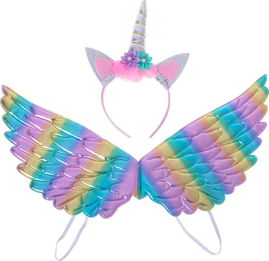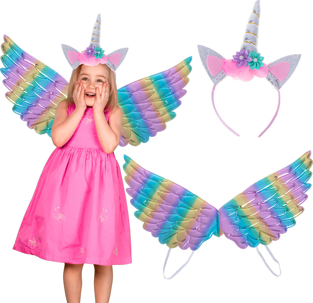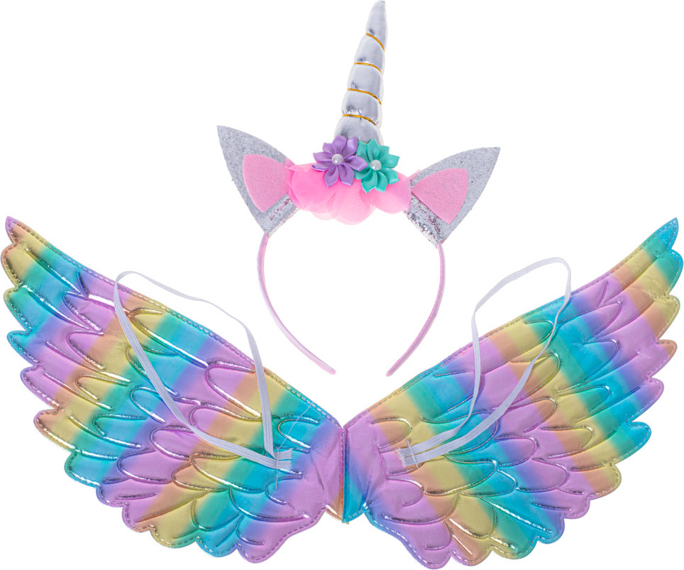 Celá sada je dokonalým základom pre vytvorenie nádherného kostýmu - prvky je možné kombinovať s ďalšími doplnkami a prevlekmi a vytvoriť tak ten najoriginálnejší kostým, ktorý splní sny vášho dieťaťa. Všetky prvky sú vyrobené z vysoko kvalitných materiálov, aby bolo zaistené dlhé používanie a pohodlné nosenie. Uši a roh na čelenke, rovnako ako dúhová krídla, sú polstrované, aby nepadali. Všetky prvky sú navyše vyrobené z príjemného materiálu. Univerzálna je tiež veľkosť príslušenstva - je vytvorené tak, aby vyhovovalo každému.