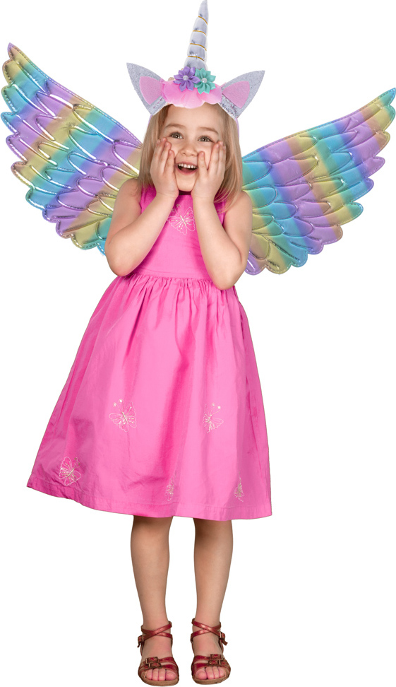 Hľadáte skvelý maškarný kostým na ples, ktorý poteší nielen vaše dieťa, ale aj ostatné? Kostým jednorožca určite každého ohromí! V sade nájdete čelenku s flitrovanými ušami a výrazným jedným rohom, ale aj dúhové krídla. Vaše dieťa sa bude môcť prezliecť za kúzelné zviera, ktoré všetci tak dobre poznajú – jednorožca!
