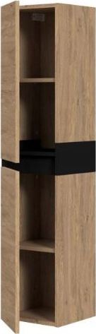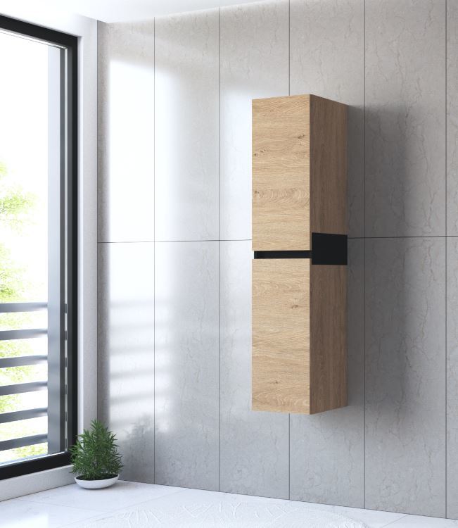 Kúpeľňová vysoká závesná skrinka pojme obrovské množstvo vecí. Dvojdverová skrinka s policami bude skvele slúžiť na ukladanie osušiek, uterákov alebo kozmetiky. Skrinka je vyrobená z laminovanej nábytkovej dosky v dekore zlatého duba v kombinácii s čiernou farbou. Vďaka tomu vyzerá skrinka veľmi moderne a elegantne. Skrinka je osadená soft close pánty, ktoré zaručujú jednoduché používanie.