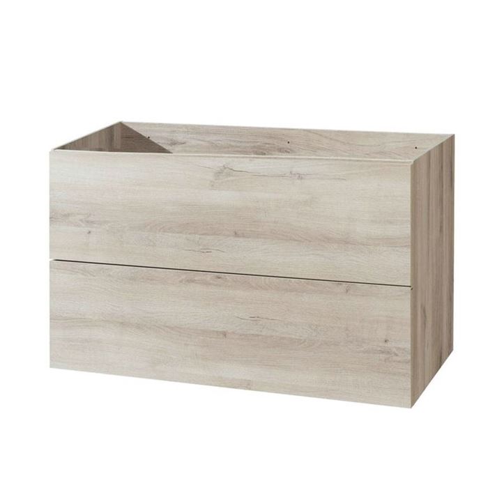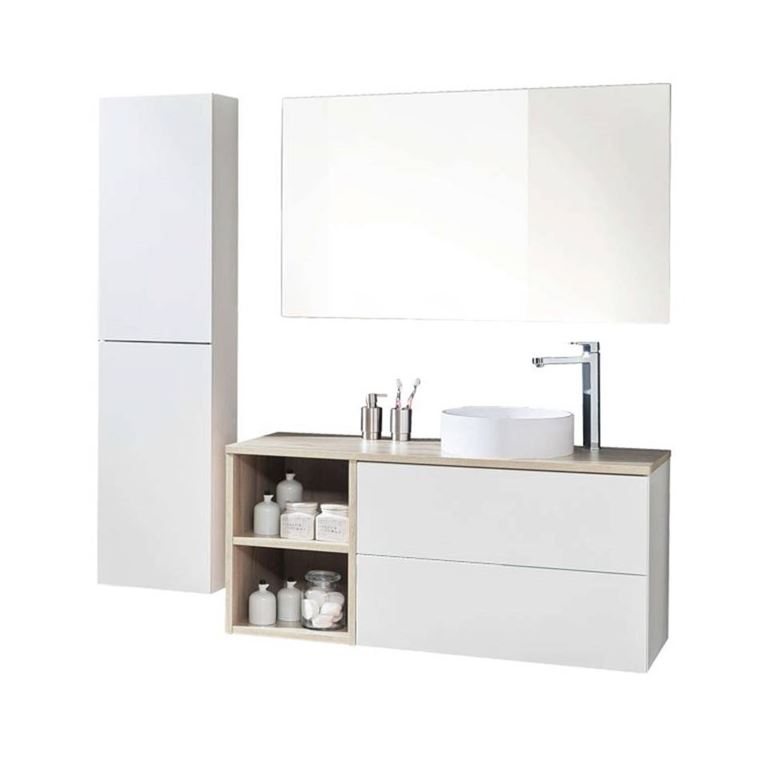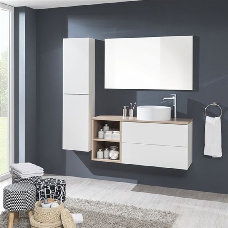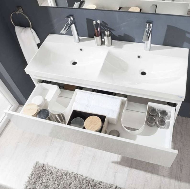 Kúpeľňová skrinka má dve priestranné zásuvky a je možné ju kombinovať s umývadlom, prípadne kúpeľňovou doskou na skrinku.