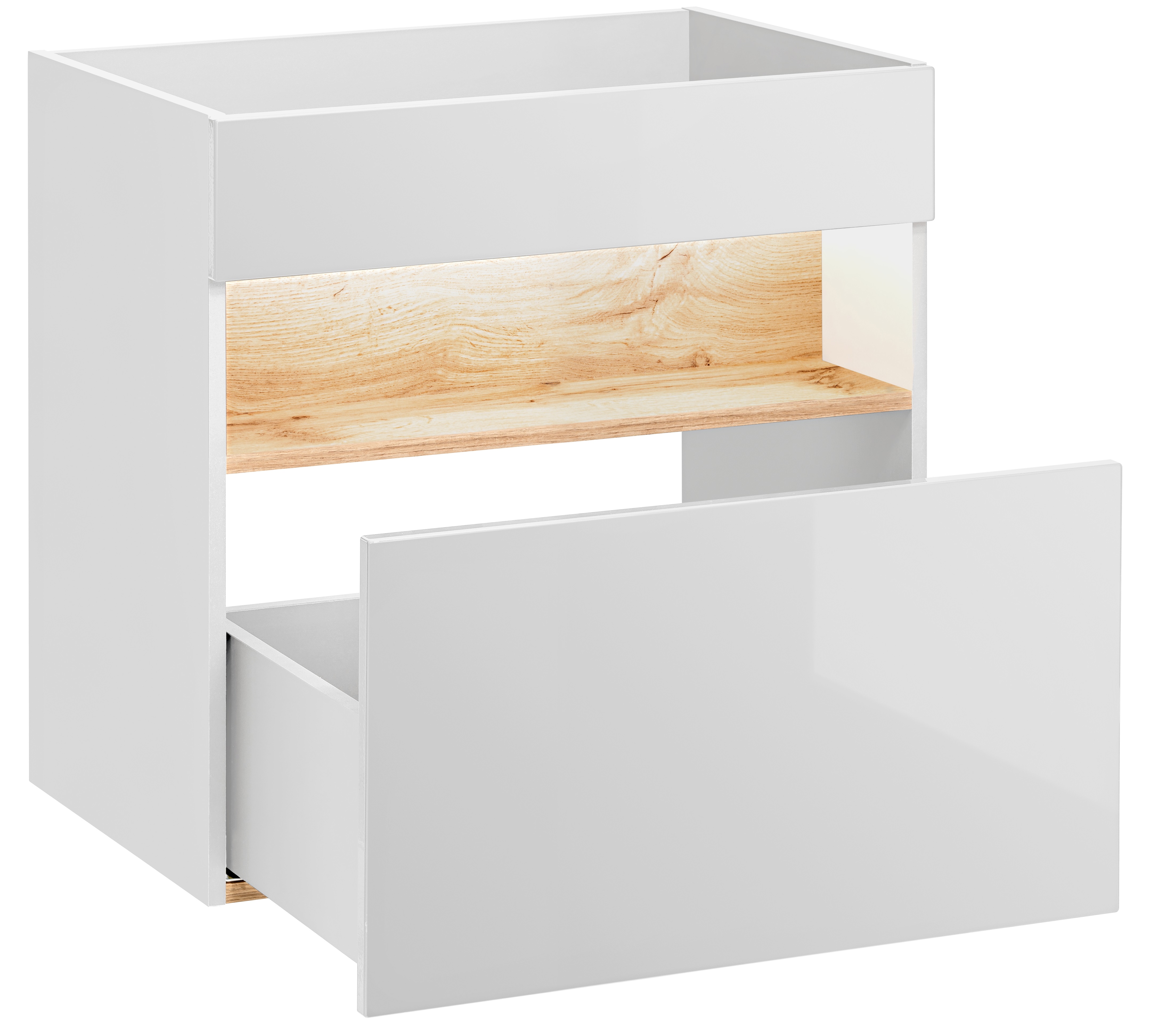 Luxusná závesná skrinka na integráciu umývadla pojme obrovské množstvo vecí. Pod úrovňou pre umývadlo nájdete priestranný šuplík a nasvietenú poličku. O bezproblémové používanie a dlhú životnosť sa stará korpus z kvalitných lamino dosiek a čela z MDF dosiek s ABS ochranou hrán spolu s pojazdmi šuplíkov s tichým dovieraním. Skvelým doplnkom je skryté LED svetlo, ktoré dodáva intímnu atmosféru a pocit luxusu.