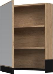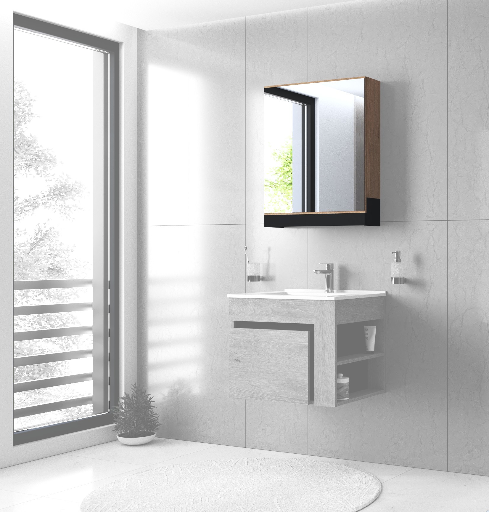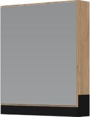 Jednodverová závesná skrinka Duesa so zrkadlom sa vyznačuje moderným vzhľadom a originálnou kombináciou farieb. Skrinka je vyrobená z laminovanej nábytkovej dosky v dekore zlatého duba v kombinácii s čiernou farbou. Vďaka soft close pántom sa skrinka otvára ľahko a plynulo. Skrinka obsahuje dve police, do ktorých sa zmestí mnoho kozmetiky a doplnkov.