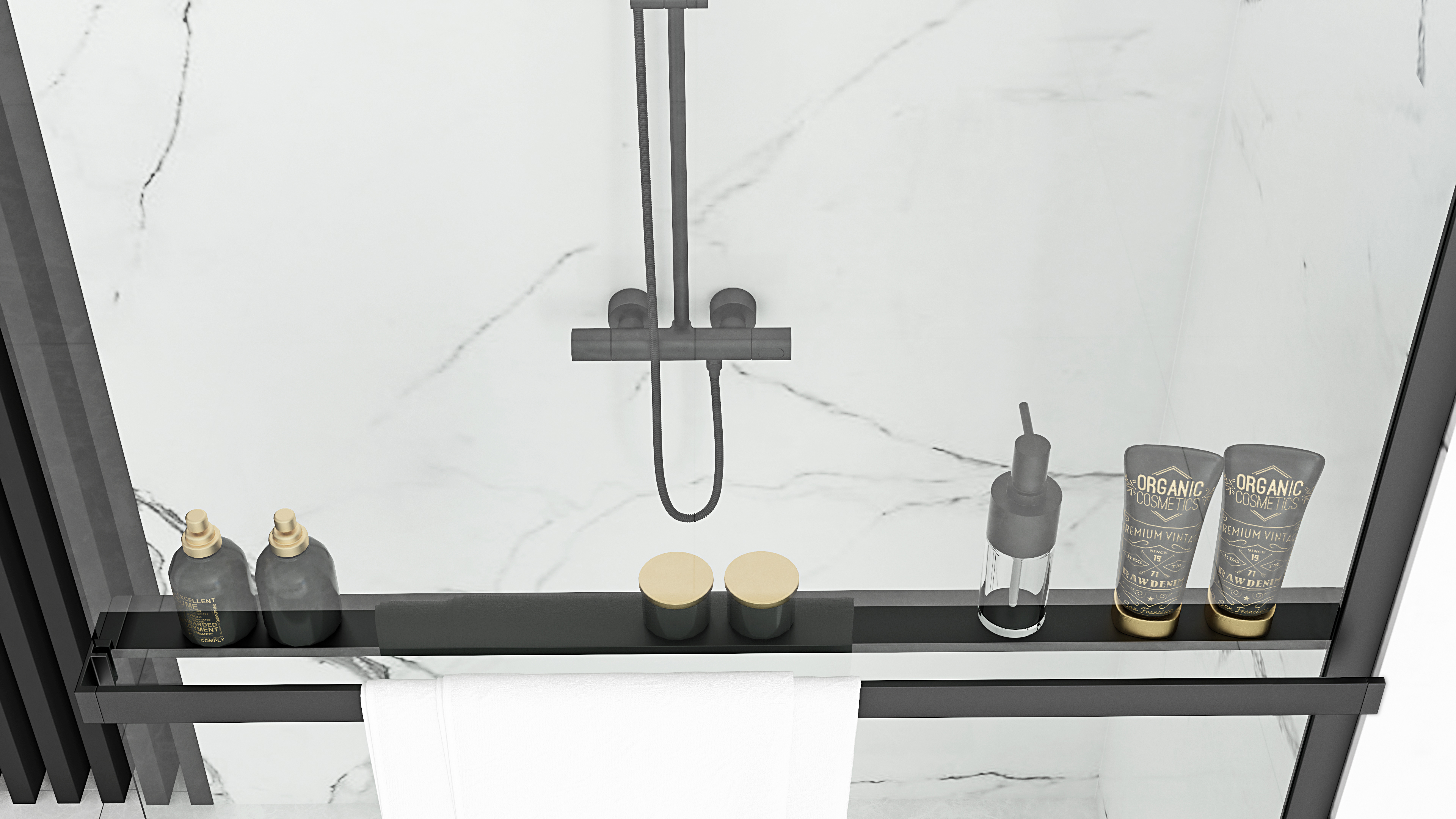 Zástena je vybavená hliníkovou policou EVO v čiernej matnej farbe, ktorá ponúkne z jednej strany priestrannú policu na odkladanie hygienických potrieb az druhej strany praktický jednoramenný vešiak na prehodenie osušky.