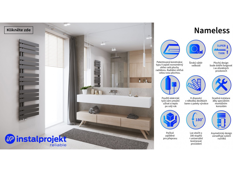 Radiátor do kúpeľne už dávno nie je nudný biely rebrík. To napokon ukazuje radiátor NAMELESS, ktorý ponúka svieži dizajn . Vďaka svojej konštrukcii sa na kúpeľňový radiátor ľahko vešajú uteráky. Tie rýchlo usychajú. Vykurovanie je možné pomocou elektrickej vykurovacej tyče alebo klasickým obehovým čerpadlom.