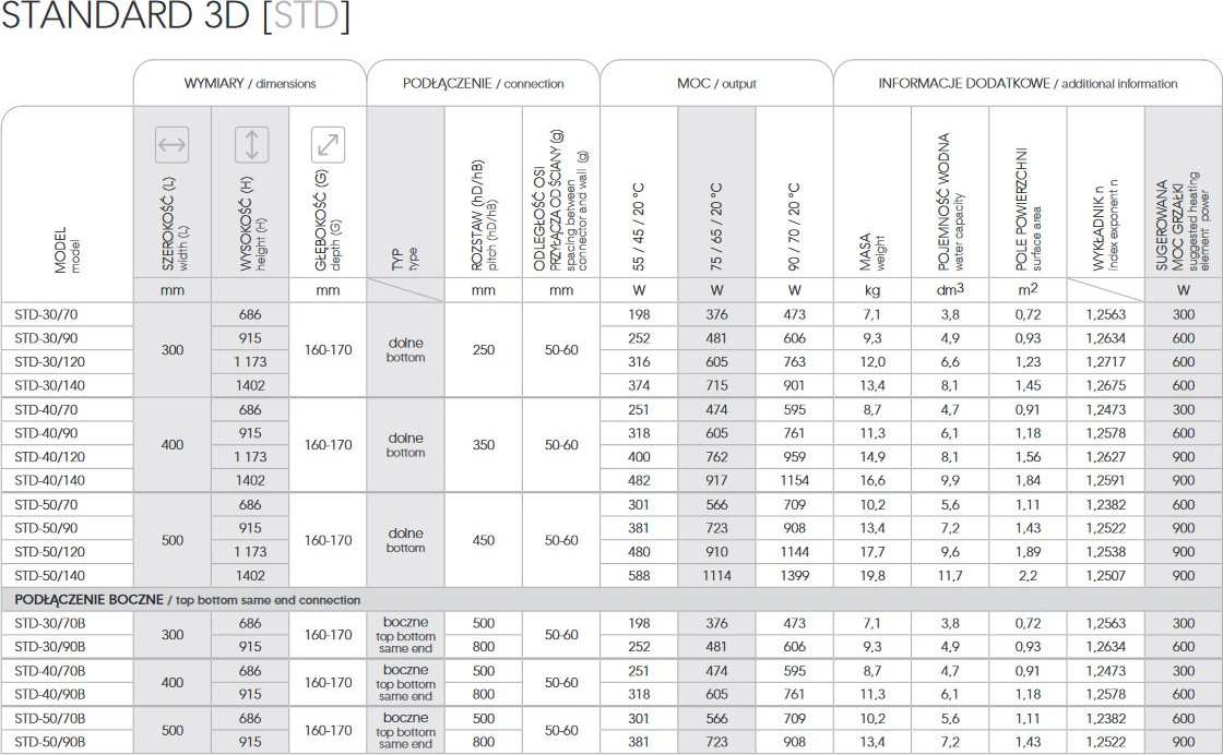 • Pripojenie radiátora: 300 x 915 mm, výkon 481 W, Klasické (rozteč), 300 x 1173 mm, výkon 605 W, Klasické (rozteč), 300 x 1402 mm, výkon 715 W, Klasické (rozteč), 400 x 686 mm, výkon 474 W, Klasické (rozteč), 400 x 915 mm, výkon 605 W, Klasické (rozteč), 400 x 1173 mm, výkon 762 W, Klasické (rozteč), 400 x 1402 mm, výkon 917 W, Klasické (na rozteč), 500 x 686 mm, výkon 566 W, Klasické (na rozteč), 500 x 915 mm, výkon 723 W, Klasické (na rozteč), 500 x 1173 mm, výkon 910 W, Klasické (na rozteč) rozstup), 500 x 1402 mm, výkon 1114 W, Klasické (na rozstup), Bočné, 300 x 686 mm, výkon 376 W, Bočné, 300 x 915 mm, výkon 481 W, Bočné, 400 x 686 mm, výkon 474 W , Bočné, 400 x 915 mm, výkon 605 W, Bočné, 500 x 686 mm, výkon 566 W, Bočné, 500 x 915 mm, výkon 723 W, 300 x 686 mm, výkon 376 W, Klasické (na rozstup)