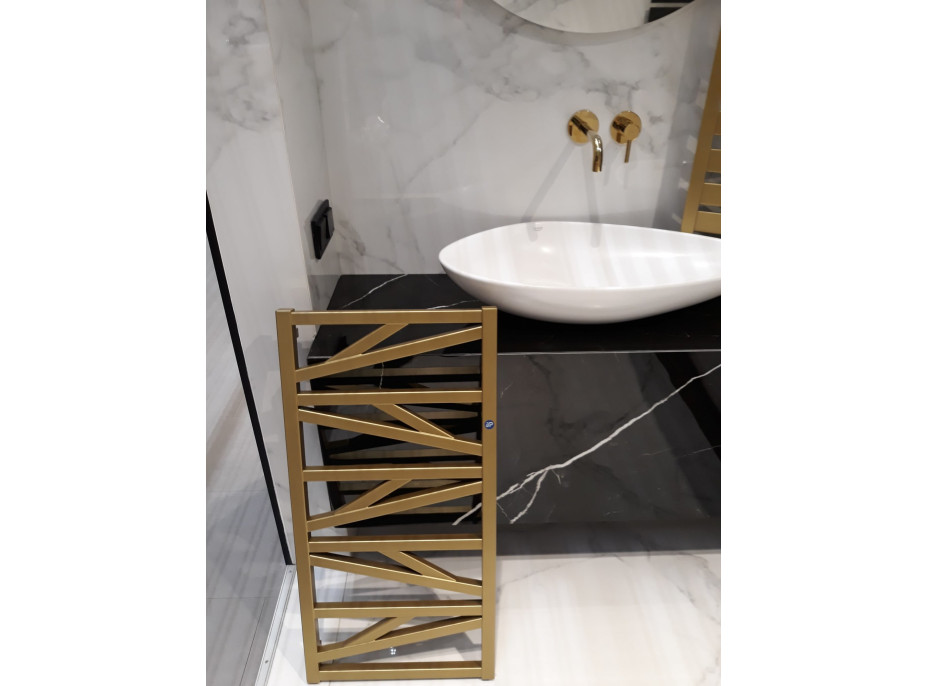 Prenikavo jemná forma spojenia hranatých profilov pod rôznymi uhlami , pôsobí veľmi hravo, ale pritom veľmi elegantne. Tvorivé prepojenie všetkých kúpeľňových štýlov. Radiátor TRICK zlatá farba je možné objednať za príplatok aj so spodným centrálnym pripojením. Kúpeľňové radiátory sú vhodné na klasické vykurovanie aj na použitie vykurovacej tyče . Kúpeľňové radiátory kompletne zmenia vaše predstavy o radiátoroch ako ich poznáte. Vďaka moderným technológiám a materiálom sú radiátory do kúpeľne opatrené dokonalou antikoróznou vrstvou. Na túto vrstvu je ešte len nanášaná veľmi kvalitná prášková farba, ktorá je následne vypálená.