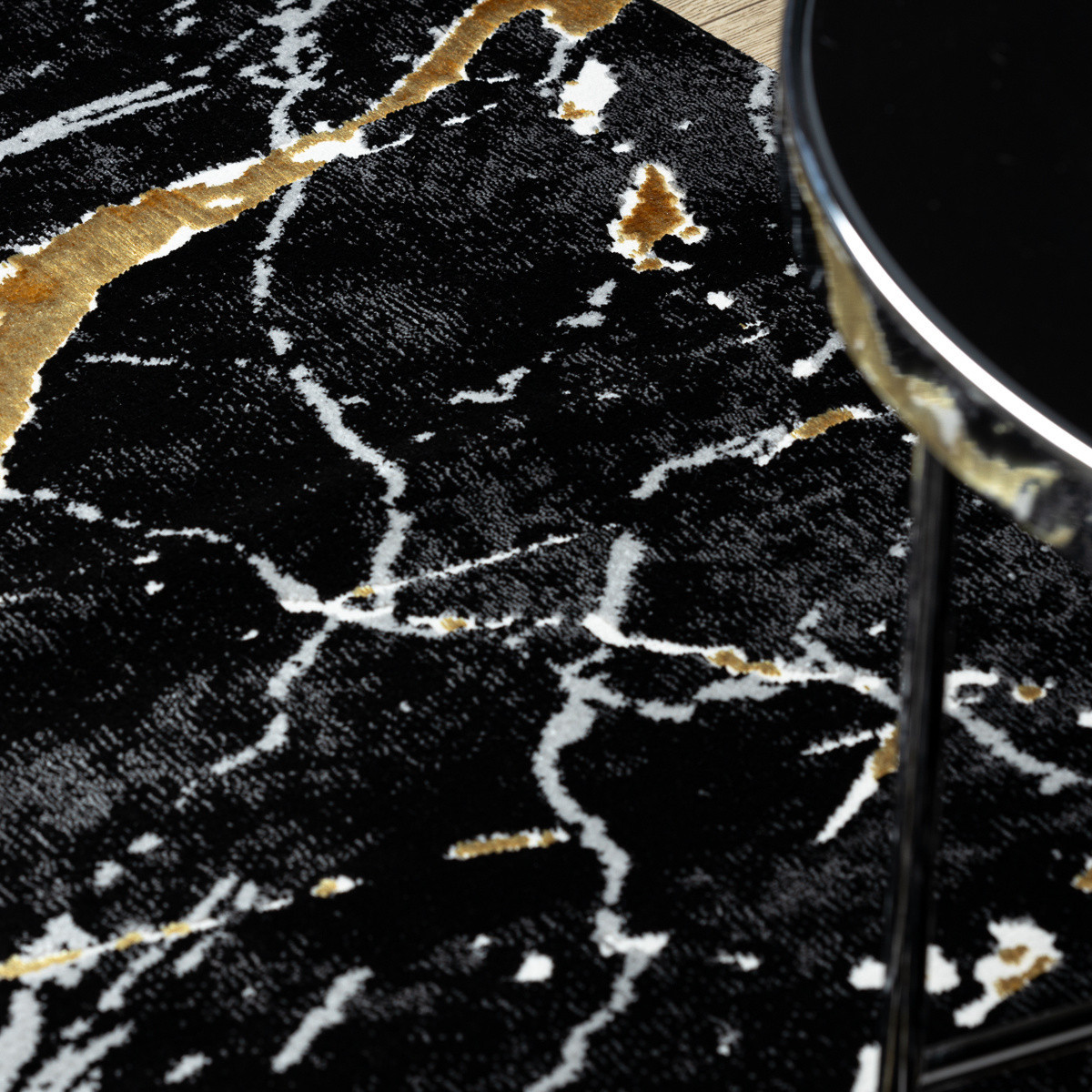 Kusový koberec Allure 1963 black/gold je pro ty, kteří chtějí dodat svému domovu nádech luxusu a odvážného stylu. Černý podklad s výraznou mramorovou kresbou je protkán zlatými a šedými liniemi, které působí jako třpytivé žilkování drahého kamene. Výsledkem je design, který vyzařuje noblesu, eleganci a dramatický šarm. Vlas tvoří směs polypropylenu a polyesteru, díky čemuž je koberec odolný, měkký a snadno se udržuje. Dvě výšky vlasu vytvářejí jemný 3D efekt, který podtrhuje mramorový vzor a dodává mu hloubku i luxusní vzhled. Certifikace OEKO-TEX zaručuje zdravotní nezávadnost a šetrnost k životnímu prostředí, koberec je navíc vhodný i pro použití s podlahovým vytápěním. Allure se skvěle hodí do moderních obývacích pokojů, kde se stane výrazným středobodem, do ložnic pro vytvoření sofistikované atmosféry. Výška vlasu: 10 mm