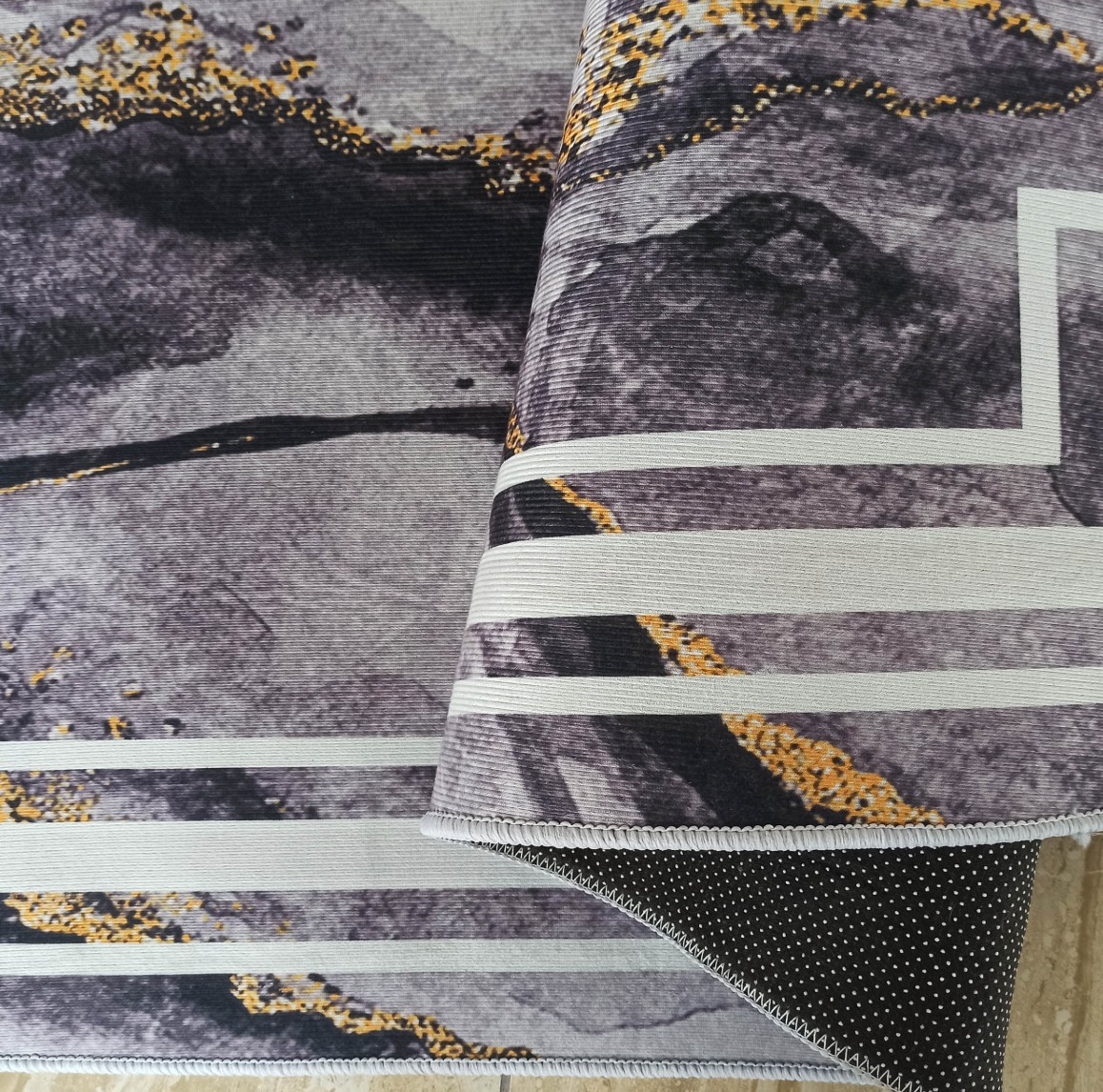 Tmavosivý moderný koberec s veľmi módnym vzorom inšpirovaným kresbou kameňa. Sýto šedé a zlaté akcenty mu dodávajú jedinečný, elegantný charakter. Koberec HONOR Rock skvele doplní každý interiér, či už klasický, alebo moderný. Je stvorený aj pre štýlovú obývaciu izbu, ale nájde si cestu aj do krásnej spálne alebo reprezentatívnej jedálne. Zlato zvýraznené "polstrovanie" a geometrické línie sú receptom na útulný, harmonický a pútavý interiér. Koberec má protišmykový podklad, takže sa nešmýka po podlahe a môžete ho ľahko položiť na panely, dosky alebo keramickú dlažbu. Je vyrobený z kvalitného polyesteru - je trvanlivý, odolný voči mechanickému poškodeniu a je možné ho prať na 30 stupňov. Svoj krásny vzhľad si zachová po veľmi dlhú dobu. Nebude meniť farbu ani sa deformovať.