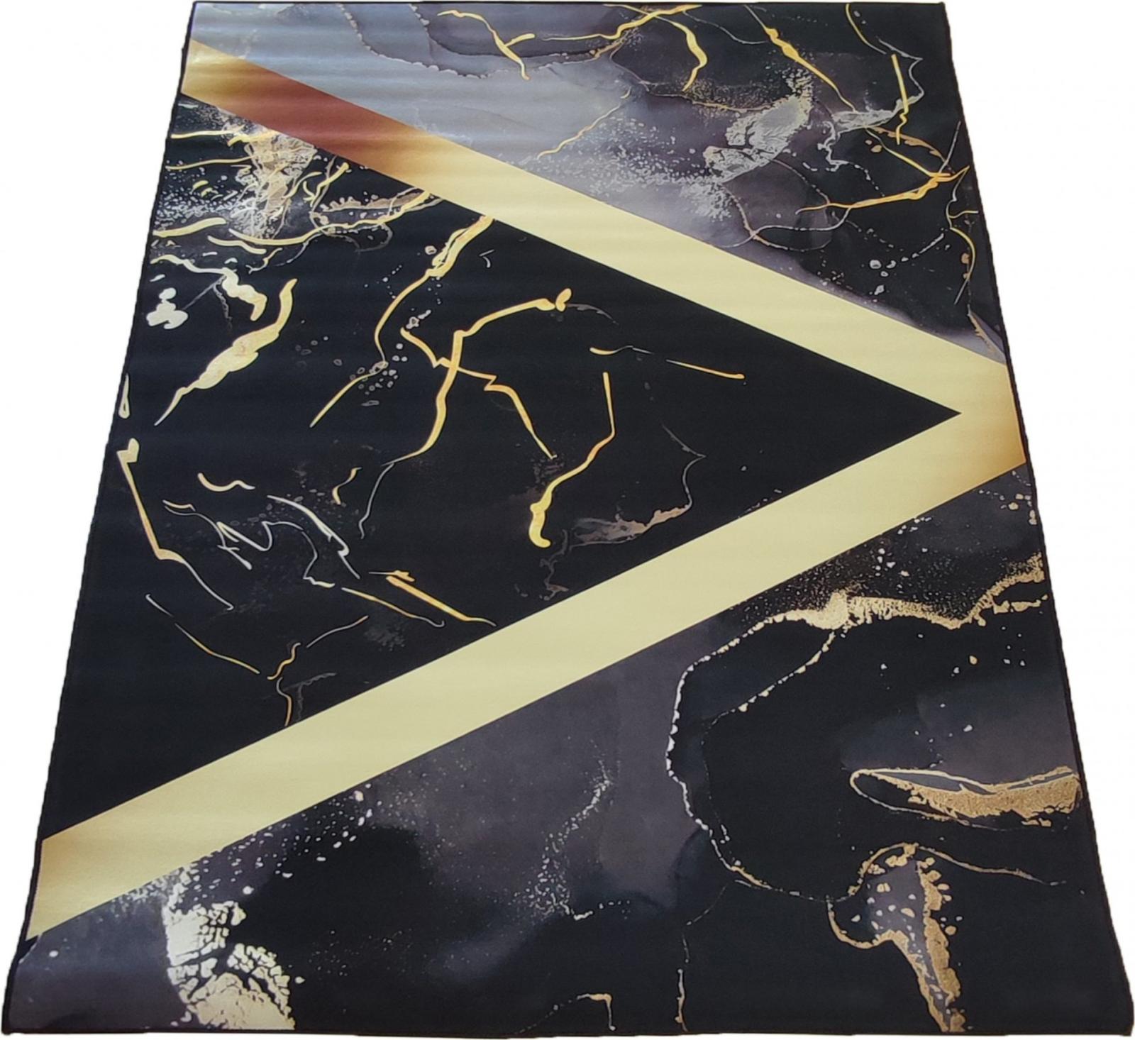 Protišmykový koberec Black&Gold - Noldo je ideálny pre interiéry v minimalistickom, industriálnom, ale aj klasickom štýle. Kombinácia čiernej so šedými a zlatými odtieňmi oživí každú miestnosť. Čierny koberec s abstraktnými motívmi je vyrobený z polyesteru vynikajúcej kvality. Tento materiál zaisťuje dlhú životnosť koberca, zaručuje, že sa vlas neopotrebováva ani nedeformuje a že je príjemný na dotyk a veľmi ľahko sa čistí. Koberec môžete dokonca prať v práčke. Pretože je spodná strana koberca protišmyková, je možné ho položiť v akejkoľvek miestnosti a na veľmi rozdielne podlahy.