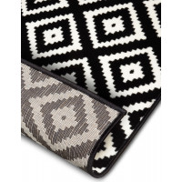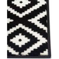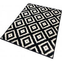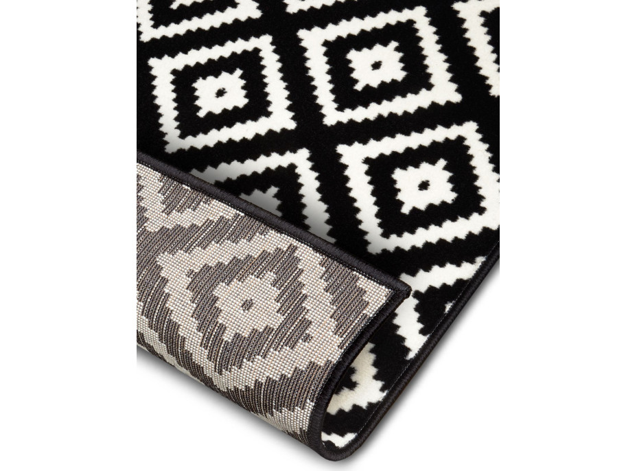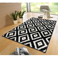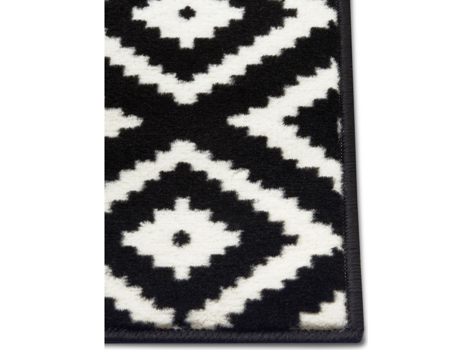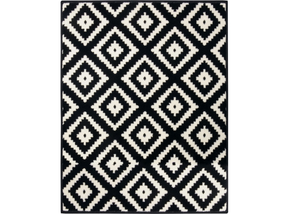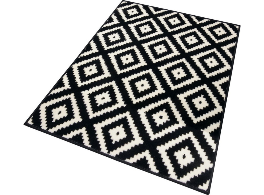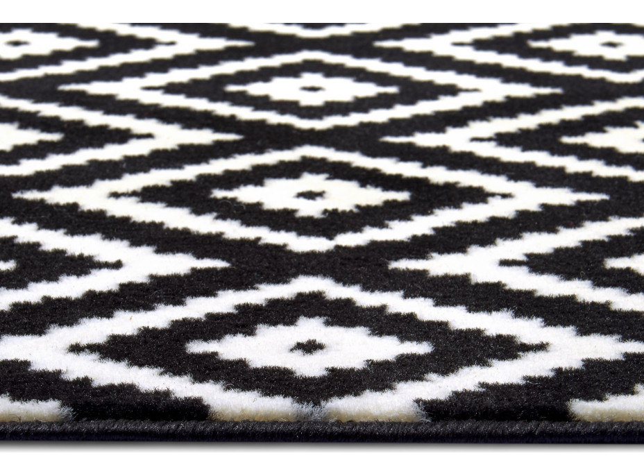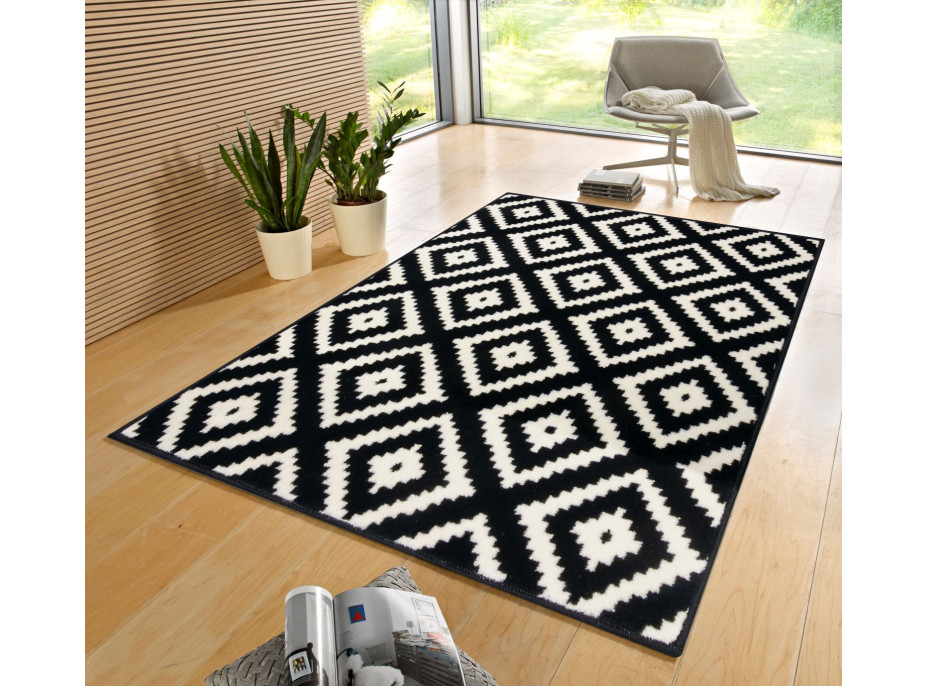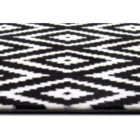 Moderný koberec v kontrastnej čierno-bielej farebnej kombinácii, ktorý svojim pútavým geometrickým motívom ozvláštni Váš interiér. Stane sa dominantou každej obývačky alebo spálne. Na jeho výrobu bol použitý pevný polypropylén, čo je odolný a ľahko udržateľný materiál.