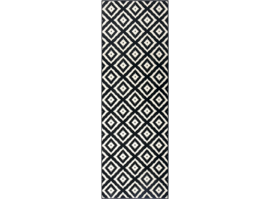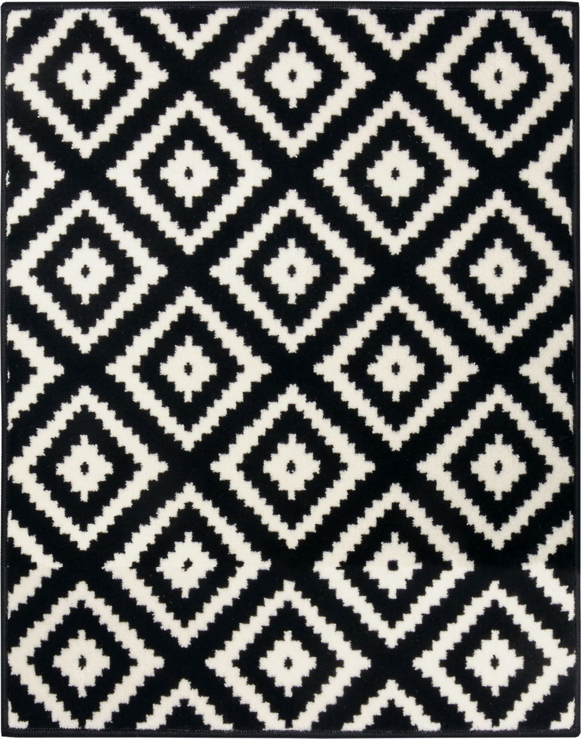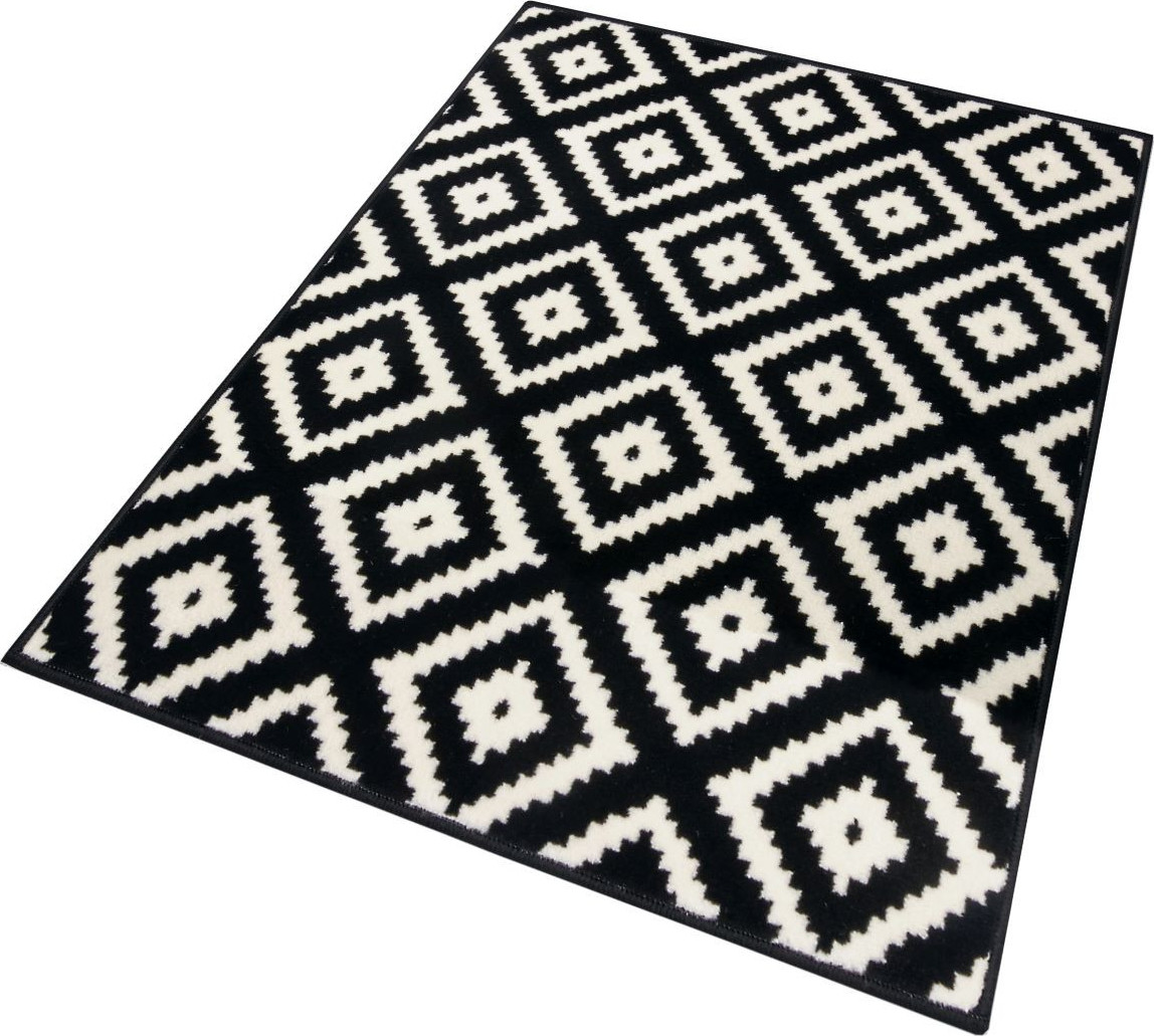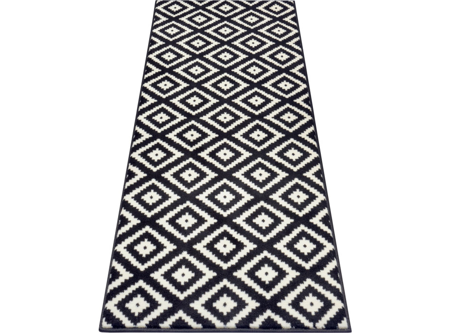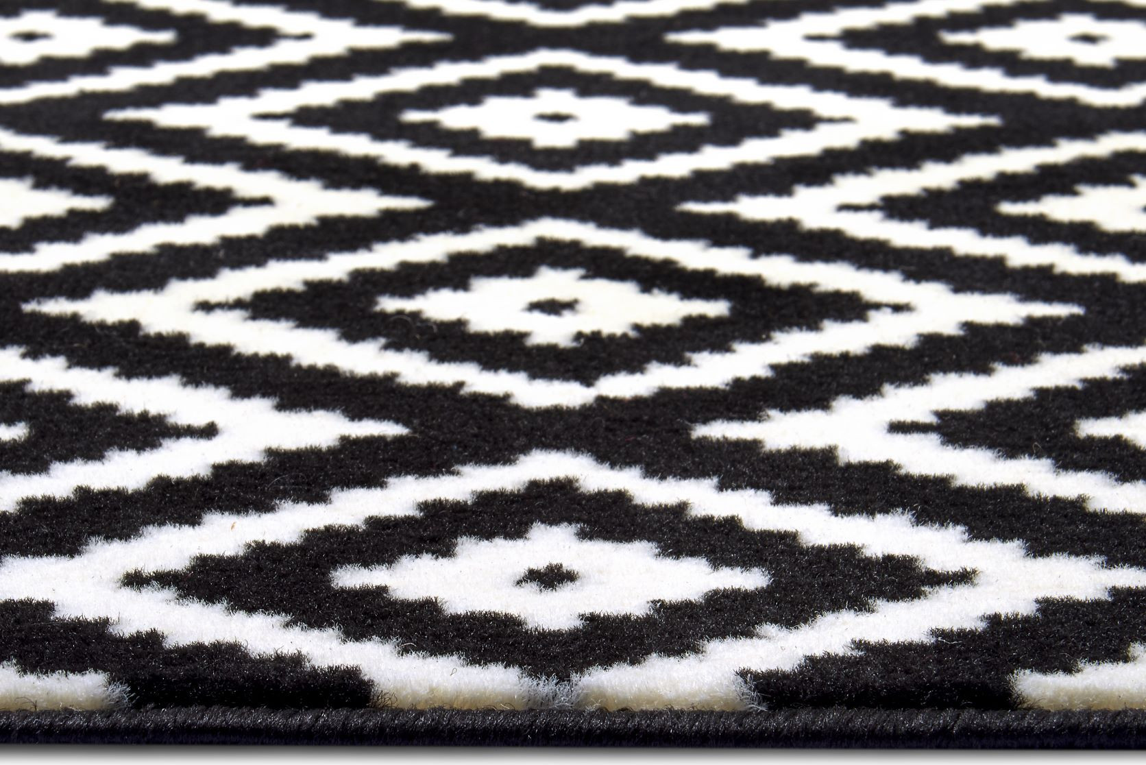 Moderný koberec v kontrastnej čierno-bielej farebnej kombinácii, ktorý svojim pútavým geometrickým motívom ozvláštni Váš interiér. Stane sa dominantou každej obývačky alebo spálne. Na jeho výrobu bol použitý pevný polypropylén, čo je odolný a ľahko udržateľný materiál.