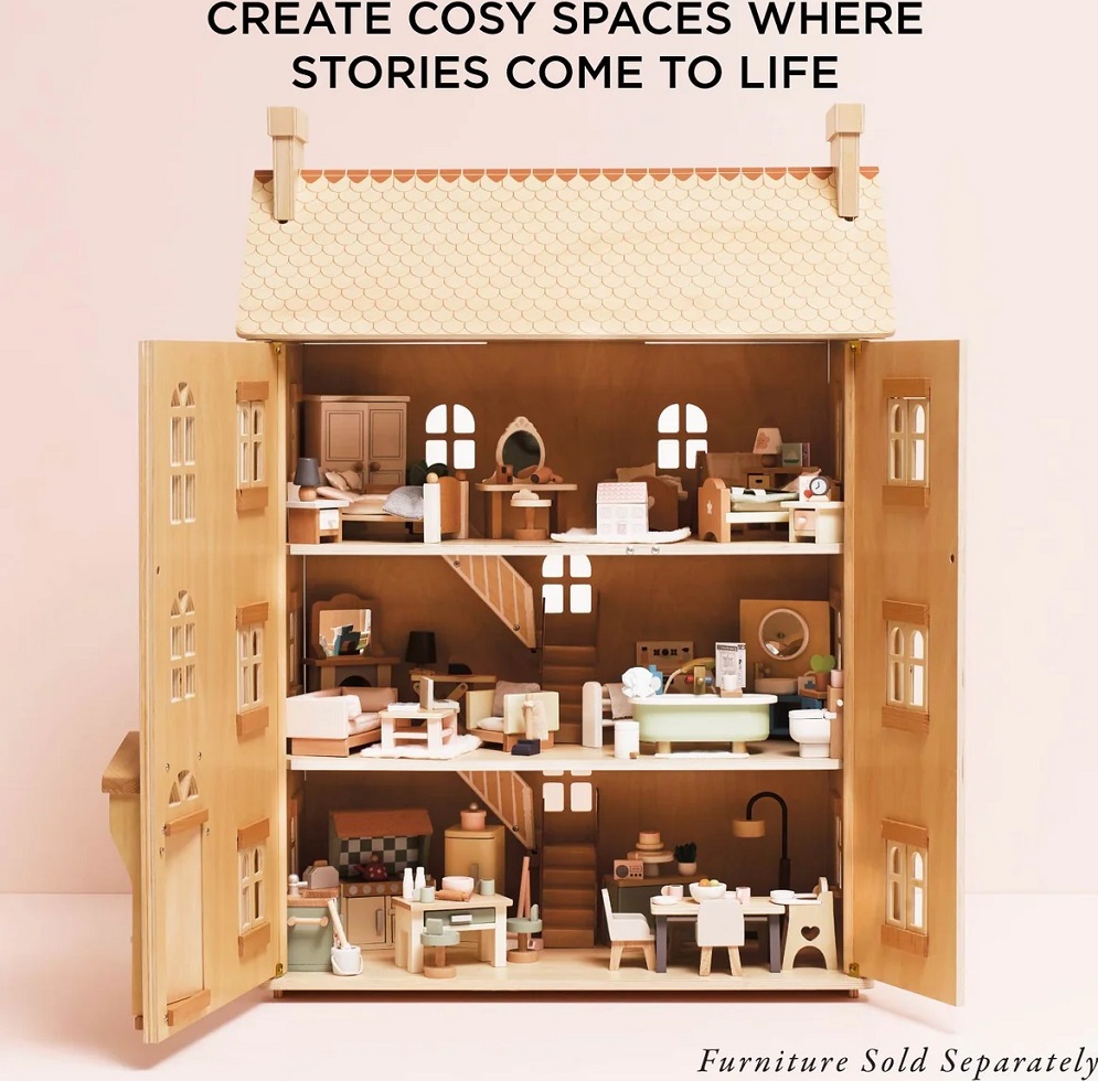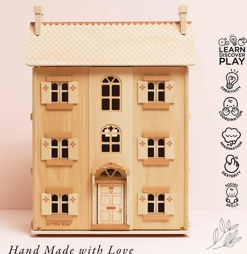 Tento nádherný domček z prírodného dreva oslavuje 30 rokov vynikajúceho designu domčekov firmy Le Toy Van. S týmto domčekom uvediete deti do magického sveta predstavivosti. Vysoký domček so štyrmi poschodiami bol vyrobený eticky s láskou, z dreva z udržateľných zdrojov s certifikáciou FSC. Krásne detailný domček má otváracie a zatváracie okná, okenice aj dvere. Táto hračka u detí rozvíja kľúčové zručnosti formou hry. Od kreativity, reči až po koordináciu ruka-oko. Výnimočná hračka plná radosti a nostalgie, s ktorou si deti užijú mnoho rokov magické hry. Domček si môžete odovzdávať z generácie na generáciu. Všetky domy pre bábiky od Le Toy Van boli navrhnuté tímom z Veľkej Británie, vyrobené boli za použitia etických praktík a udržateľných materiálov. Domček môžete dovybaviť dreveným nábytkom, bábikami a inými doplnkami. Hračky s účelomVšetky hračky firmy Le Toy Van sú vyrobené s cieľom - aby dlho vydržali. Dizajnované s láskou skúsenými remeselníkmi za použitia etických praktík a udržateľných materiálov, ktoré sú láskavejšie k našej planéte.