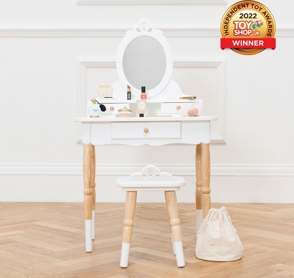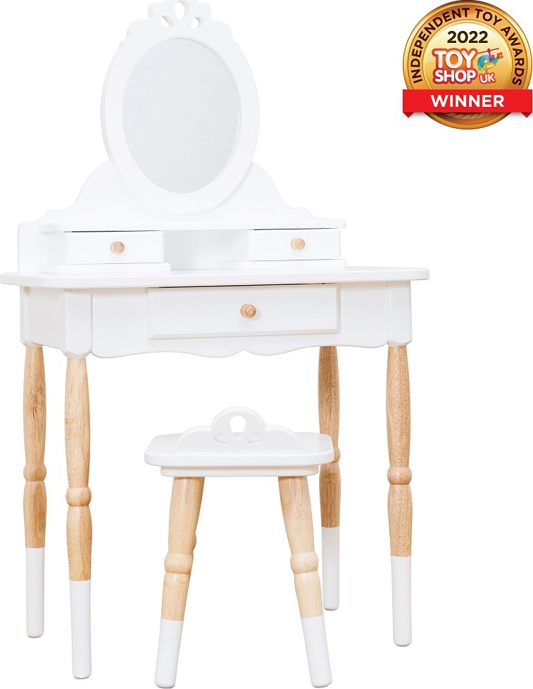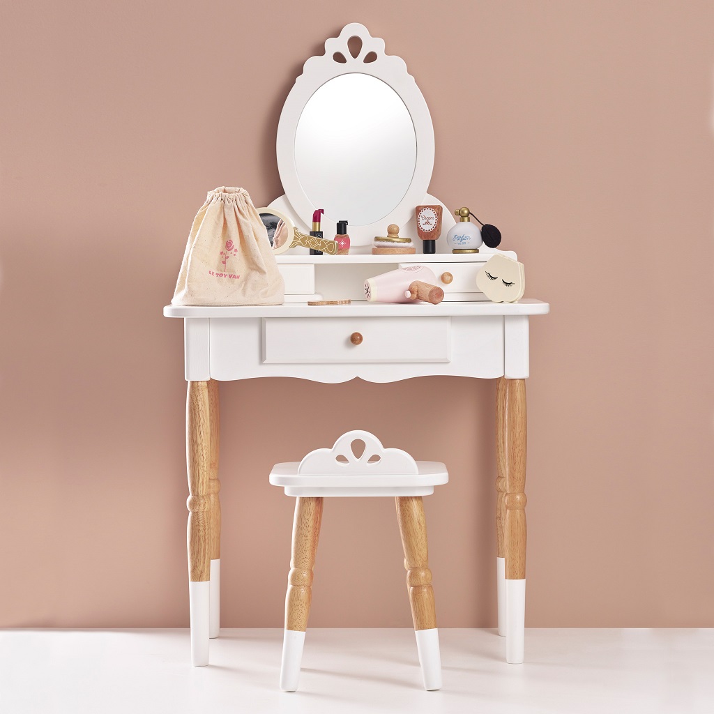 Krásny toaletný stolík v retro štýle, iste naplní sny nejedného dieťaťa. Bude sa vynímať v detskej izbe alebo herni, je veľmi elegantný a pri hre naozaj upúta pozornosť detí. Viktoriánske oválne zrkadlo z prvotriedneho, nerozbitného akrylátu, dvojposchodový stolík, 3 šuplíky – perfektné na skrytie pokladov a čačky. Vyrobené tímom talentovaných hračkárov za použitia udržateľného kaučukového dreva, krásny kúsok je vyrobený s dôrazom na detaily. Stôl aj stoličky majú nohy zaujímavého tvaru. Kombinácia bieleho a prírodného dreva pre nadčasový vzhľad. Krásny nábytok si môžete odovzdávať z generácie na generáciu.