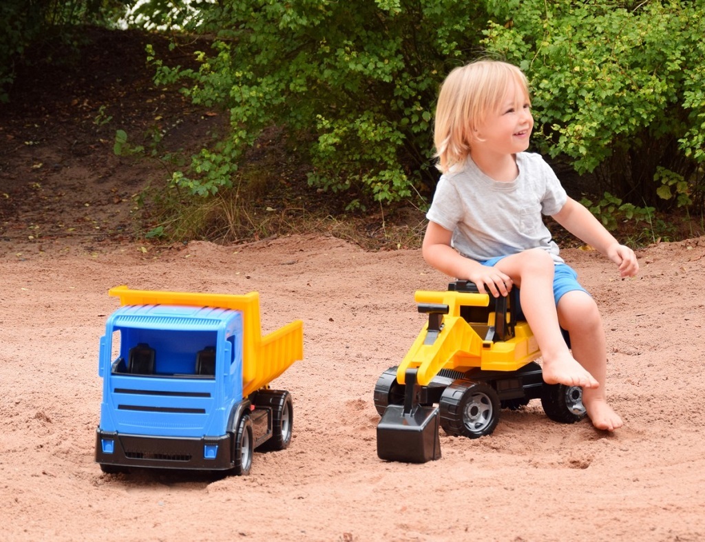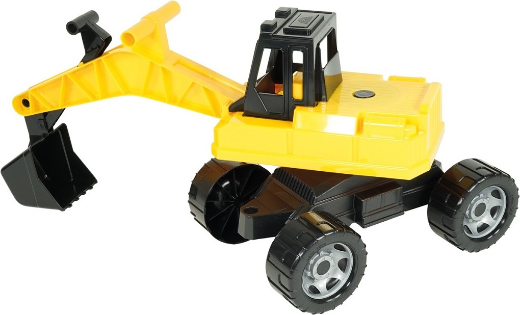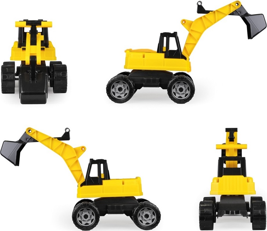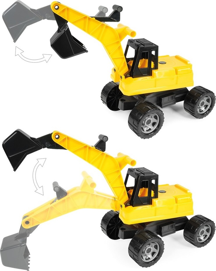 Robustný detský bager, na ktorý sa deti môžu bez obáv posadiť, s pohodlným ovládaním lyžice pomocou tiahel na ramene. Maximálna nosnosť lyžice je 25 kg. Horná časť bagru je otočná o 360 °, čo umožňuje realistickú manipuláciu. Hračka je určená na hranie doma aj vonku, najmä na piesku, a je dodávaná v pestrofarebnej krabici s priehľadom.