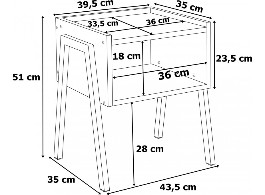 Skive je jedinečný a praktický nočný stolík. Disponuje priestrannou vrchnou doskou a užitočnou poličkou, takže všetky vaše drobnosti budú vždy po ruke. Korpus nočného stolíka je vyrobený z kvalitnej laminovanej dosky, ktorá zaisťuje pevnosť a odolnosť. Elegantné nohy vyrobené z práškovo lakovanej ocele dodávajú celku stabilitu a pevnosť. Kombinácia čiernych nôh a dekoru duba vyzerá veľmi moderne a štýlovo. Nočný stolík sa tak skvele hodí do spálne, ale môže byť aj praktickým doplnkom v obývacej izbe alebo predsieni.